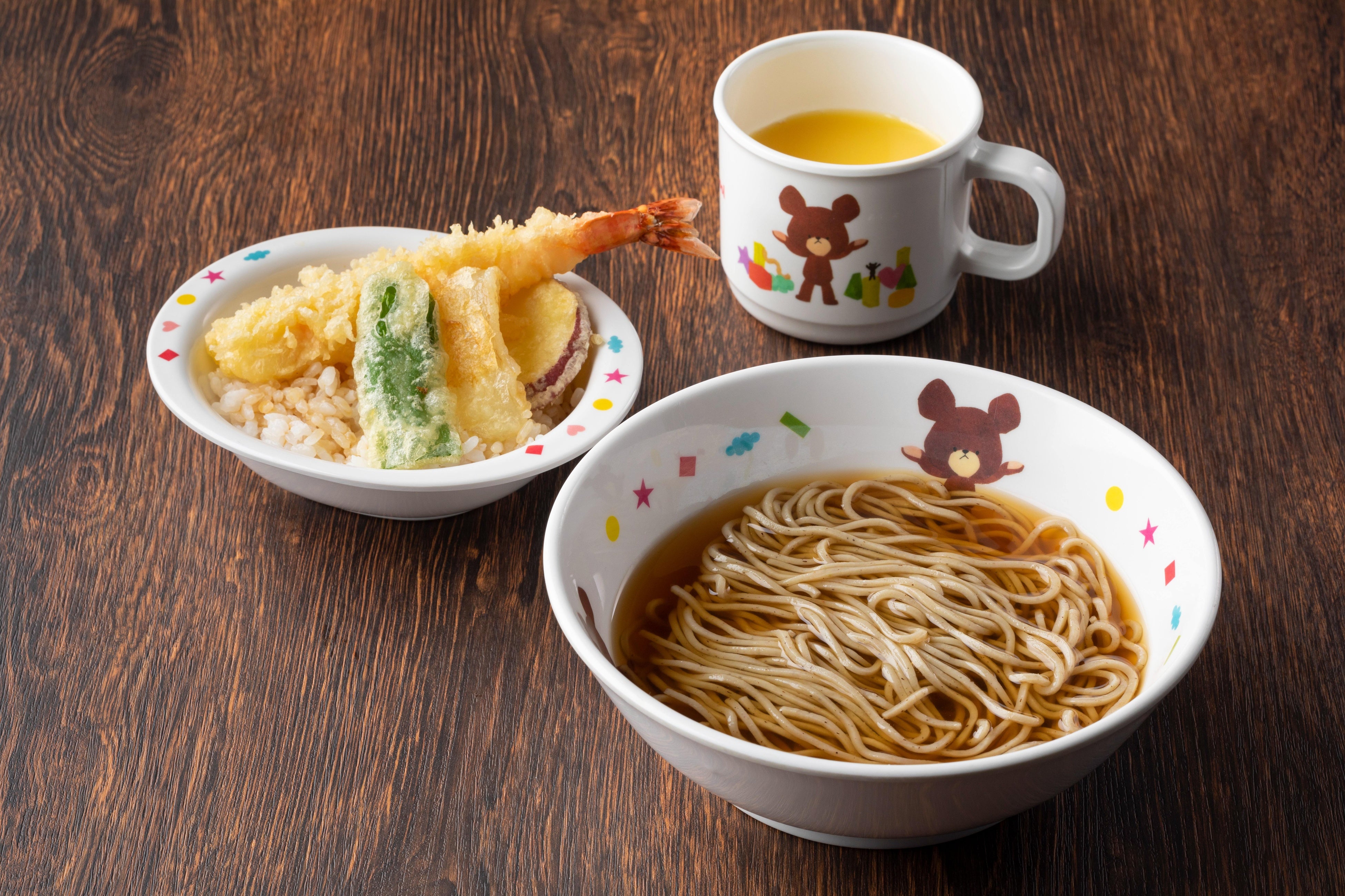 エビと野菜の天丼に、お蕎麦とジュースが付いた一品。蕎麦は温かい蕎麦と冷たい蕎麦からお選びいただけます。