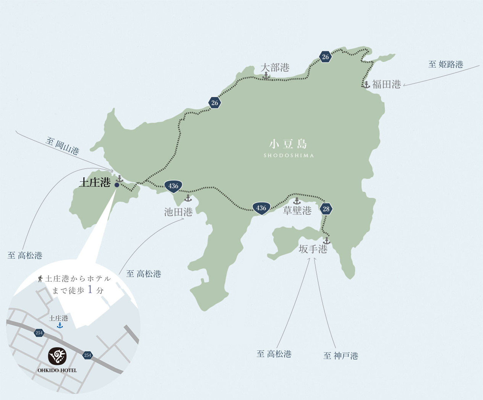 高松港からフェリーで約60分(池田港着|土庄港まで車で14分)