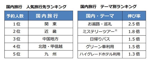 人気旅行先で1位となった関東は、邦船による小笠原諸島クルーズや季節の花の観賞を目的とした周遊ツアーが人気となっています。2位の近畿、3位の中国地方では、日帰りバスツアーが牽引し、前年比1.5倍で、全体に占める割合も10ポイント上昇しています。この時期に見頃を迎える花を観賞するツアーやゴールデンウィークに開催されるイベントに参加するツアーの集客が伸びています。また、テーマ型ツアーも好調で、今年は4年に一度の逆打ち年にあたるお遍路・巡礼のツアーが前年比2.5倍となったほか、ミステリーツアーも前年比1.8倍となりました。