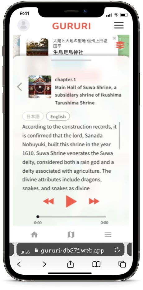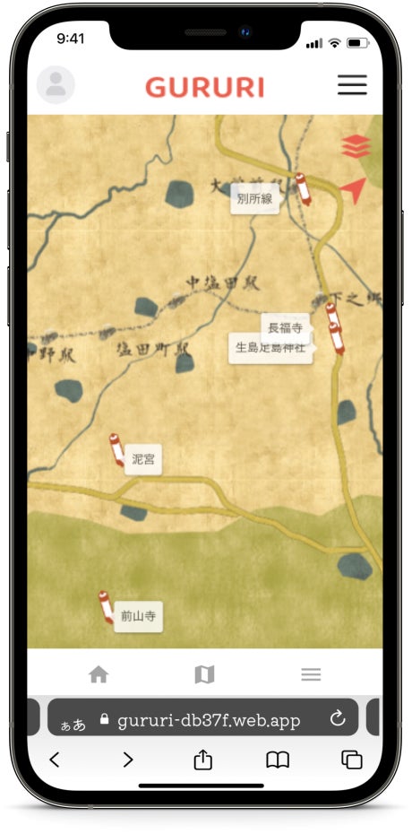 歴史コンテンツに特化した位置情報型音声ガイド・情報プラットフォーム「GURURI」。地域の寺社仏閣などの歴史コンテンツに特化してイラストマップ上に集約し、ユーザーはそこで美術館のような音声ガイドや投稿機能、訪れた史跡のログの取得も可能です。地域のコンテンツを横断的に集約していくことで、これまでの音声ガイドと違い、ユーザーはこれ一つでどこでも利用可能。また、エリアごとではなく、歴史上の人物や出来事などにちなんだテーマ型のコンテンツの製作まで行います。さらに、訪れたユーザーの属性や位置情報などのデータ分析も自治体などに向けて行っています。