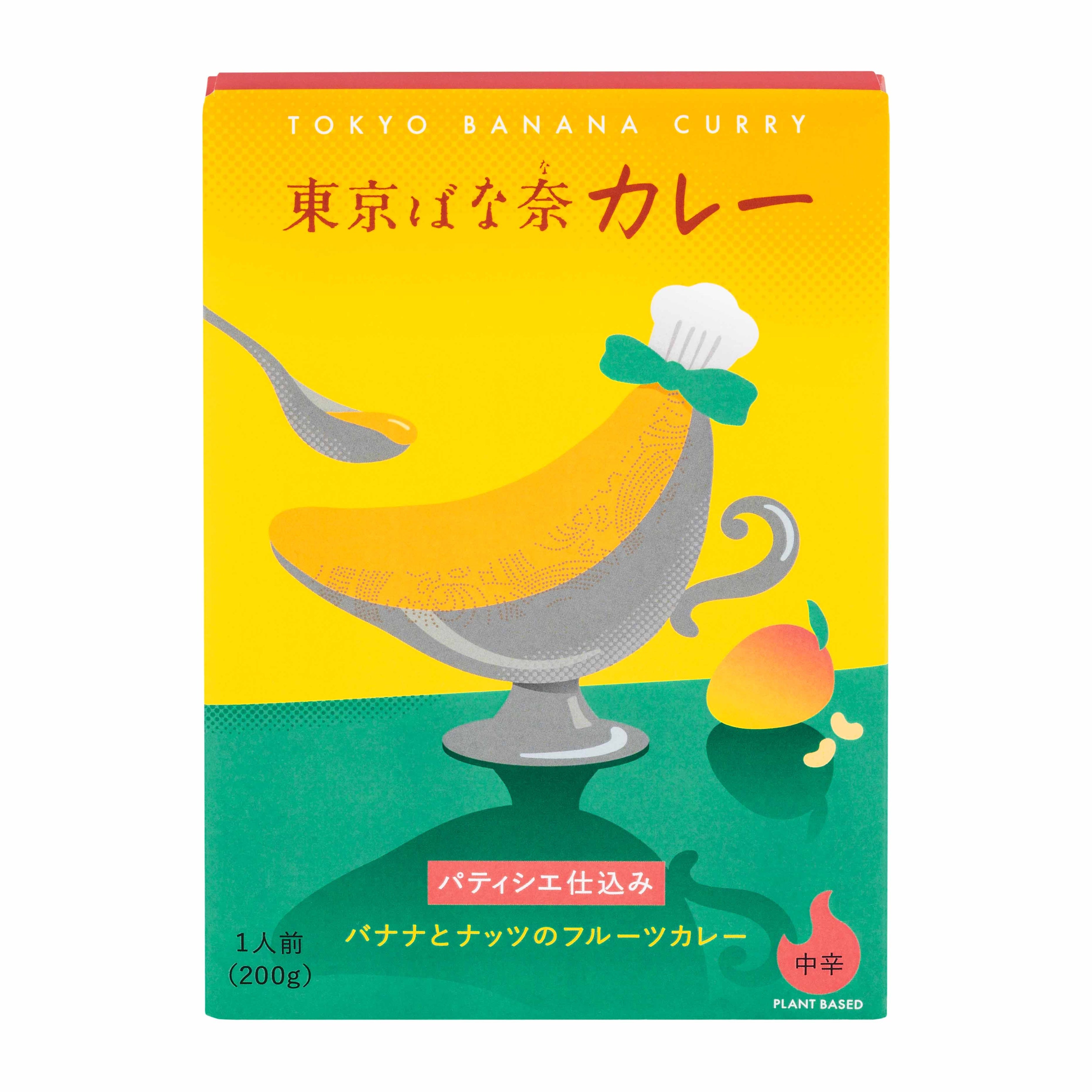 デザインコンセプトは、“レトロでかわいい洋食屋さんの東京ばな奈カレー”。カレールーを入れる銀食器の容器とシェフのコック帽をかぶった東京ばな奈アイコンが見事に融合。「バナナとバターのチキンカレー」と「バナナとナッツのフルーツカレー」の2種類を、モチーフを描き分けてグラフィカルに表現しました。