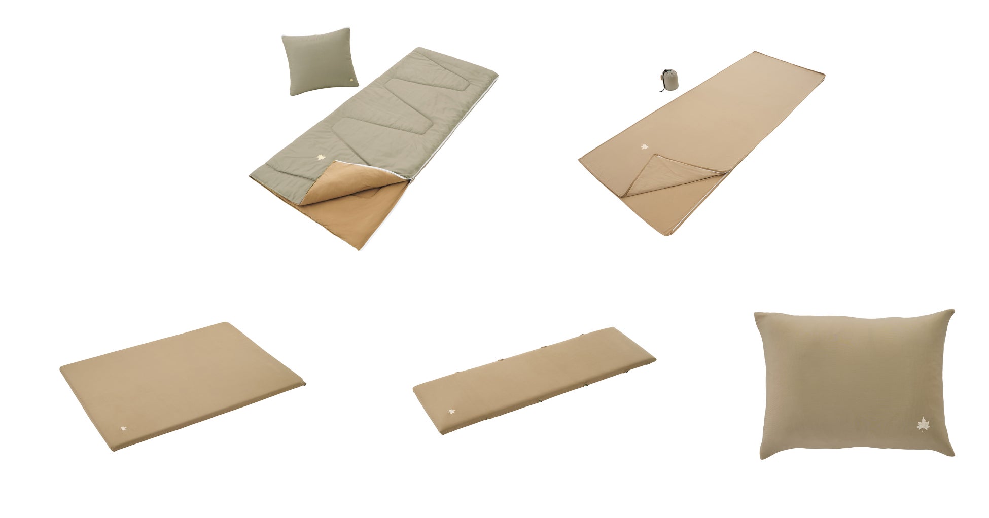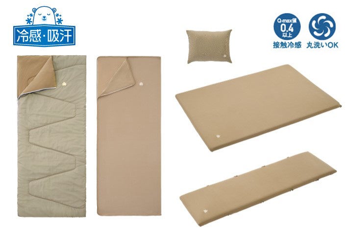 本シリーズは、すぐれた接触冷感生地を採用した寝具です。季節により肌面を変えられるリバーシブル仕様のシュラフ、ブランケット代わりにもなるインナーシュラフ、ボックスシーツ型マットカバー2サイズ、セルフインフレートまくらに対応する枕カバーの5種をラインアップします。