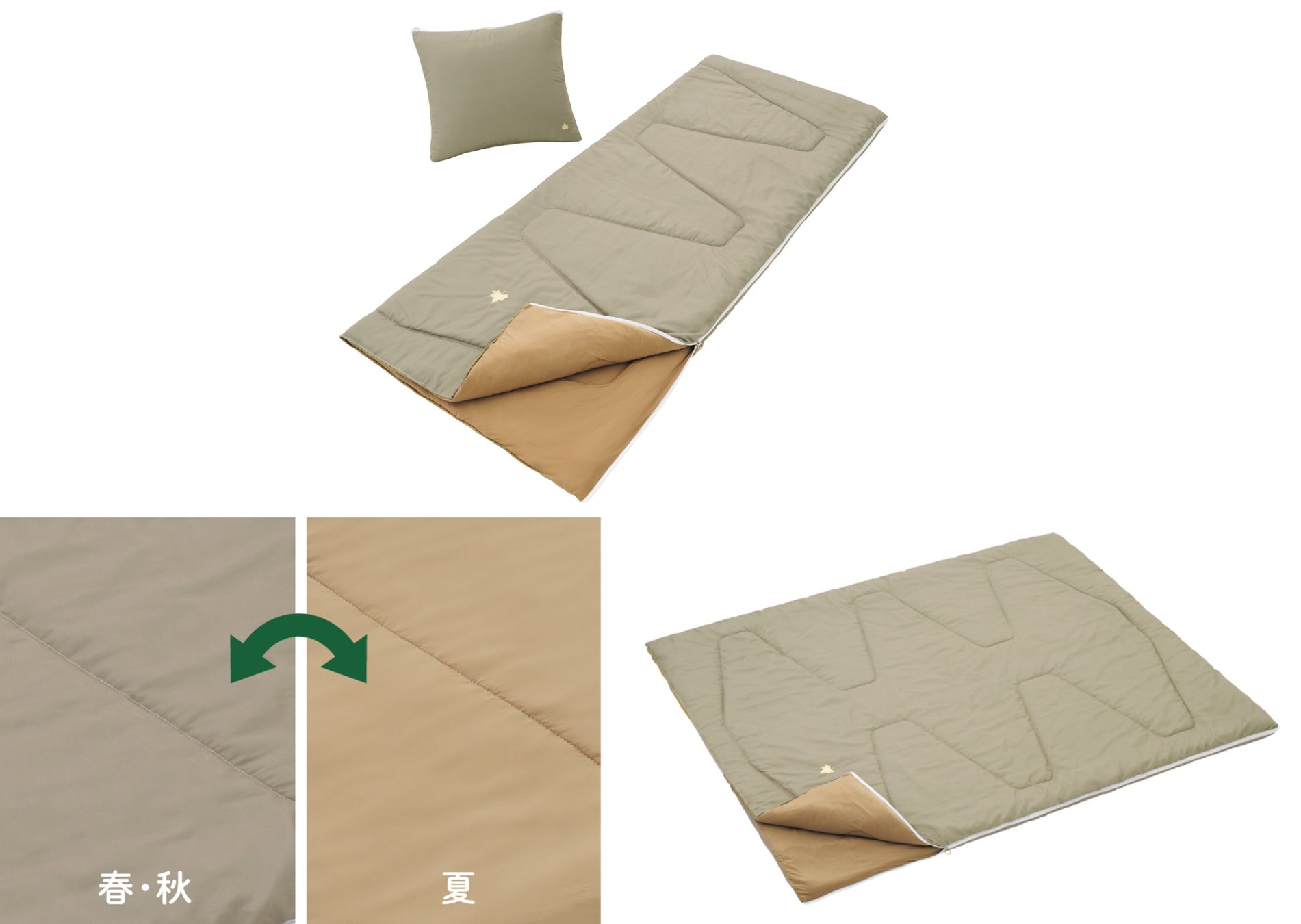 肌面には接触冷感素材を、表面には通気性がよく、さらりとした優しい肌ざわりのサーマブレスクロス素材を採用。好みや季節によって使い分けられるリバーシブル仕様になっており、ロングシーズン活躍。同一アイテムの連結ができ、ダブルサイズの寝袋としても使用可能。収納時はクッションになるので、移動中の車中や家などでも使用できる。