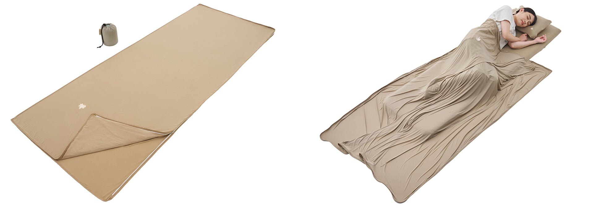 手持ちのシュラフにセットすればインナーとして活躍。シュラフに肌が直接触れないため、シュラフの内側を汚さずに清潔に使えるほか、インナーシュラフのみを洗濯することで、シュラフが長持ちする。暑い時期にはアイテム単体でブランケットとしても使用可能。