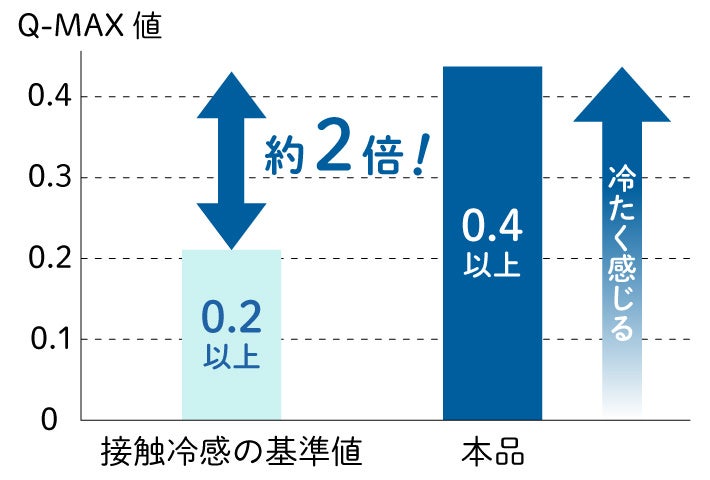 Q-max値とは、触れた時のひんやり感の指標となる数値。一般的に人が冷たいと感じる接触冷感の基準値はQ-max値0.2以上とされている。本シリーズの接触冷感生地は、Q-max値0.4以上と基準値よりも約2倍の数値で、触れるたびにしっかりと冷たさを感じることができる。