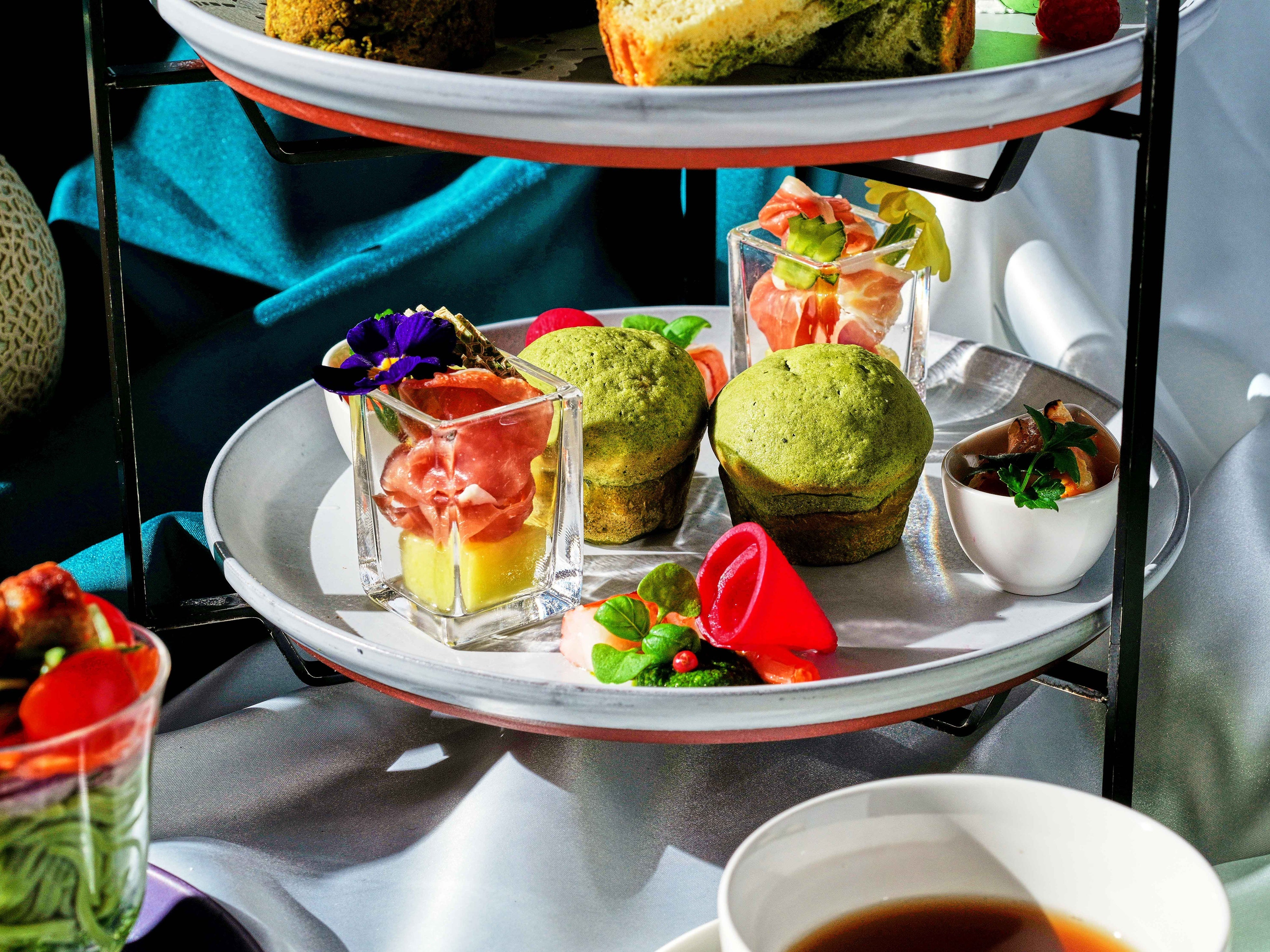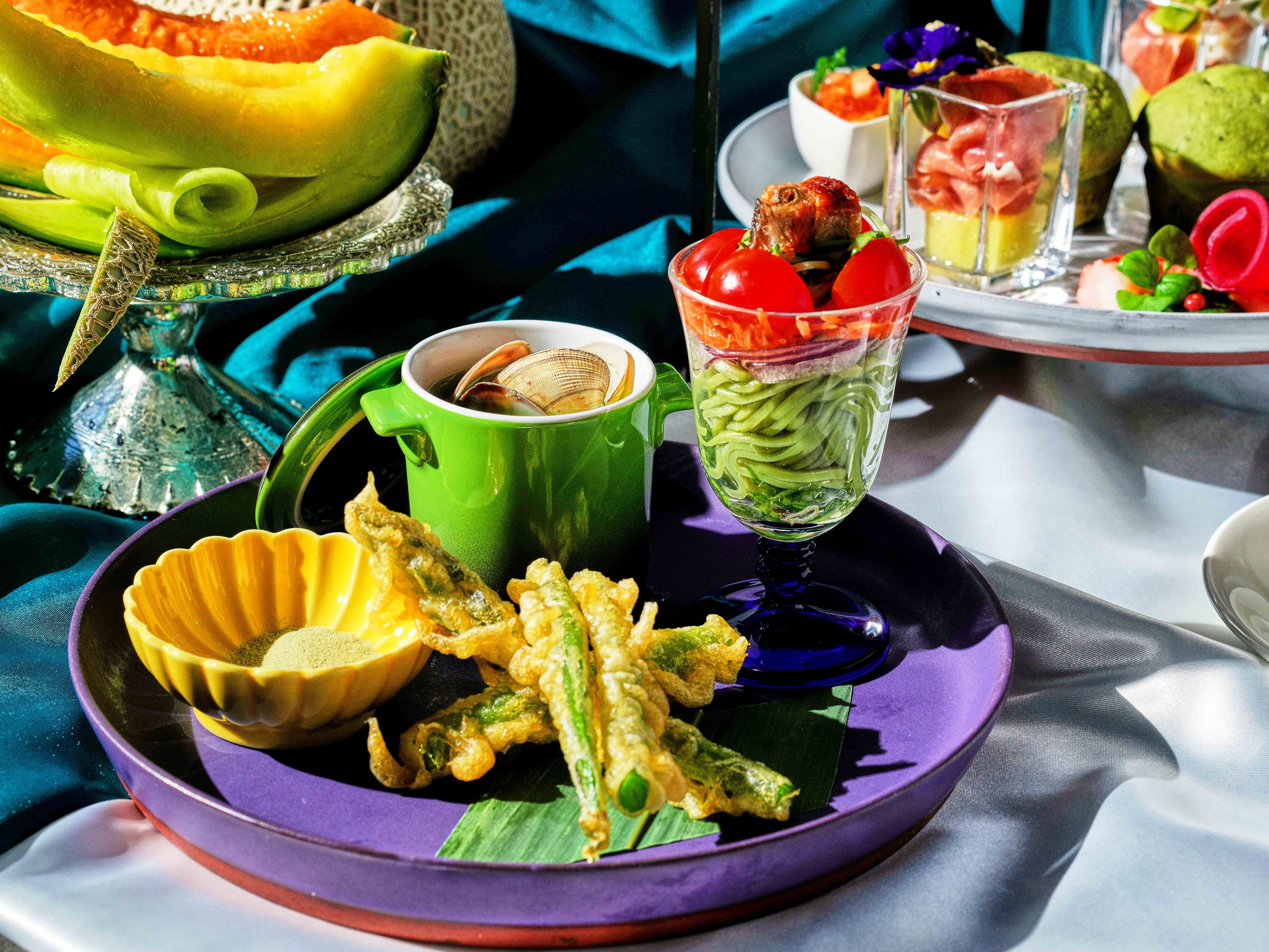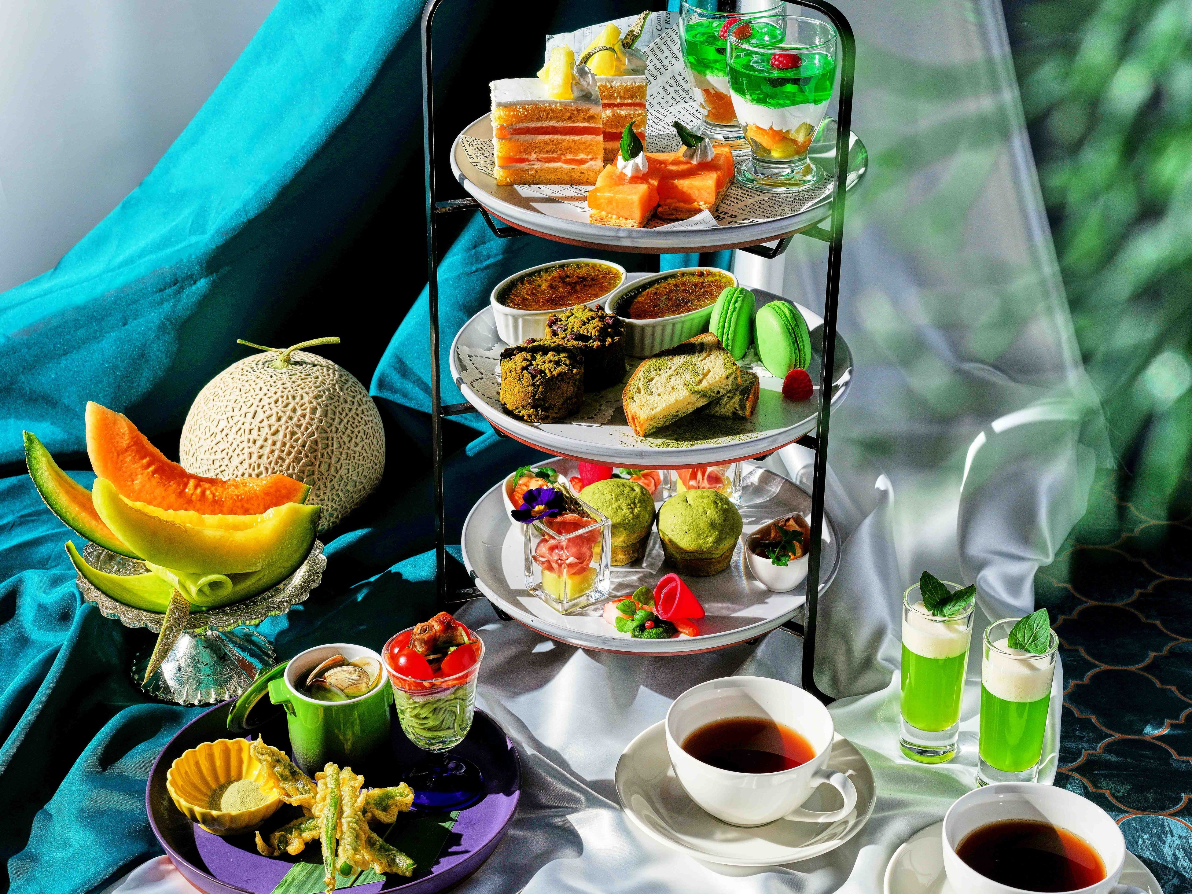 季節ごとにテーマを変えて提供しているアフタヌーンティー。今回は、旬のメロンと抹茶を存分に味わうことのできる内容です。さらに、旬のアスパラガスとインゲン豆をメレンゲの衣で揚げたフリットや、茶そばと新鮮な野菜を組み合わせたサラダなど、シェフ特製のウェルカムプレートで初夏を感じさせる料理をご用意しております。視覚的にも楽しめる新緑の中で、大人な味わいをお楽しみください。