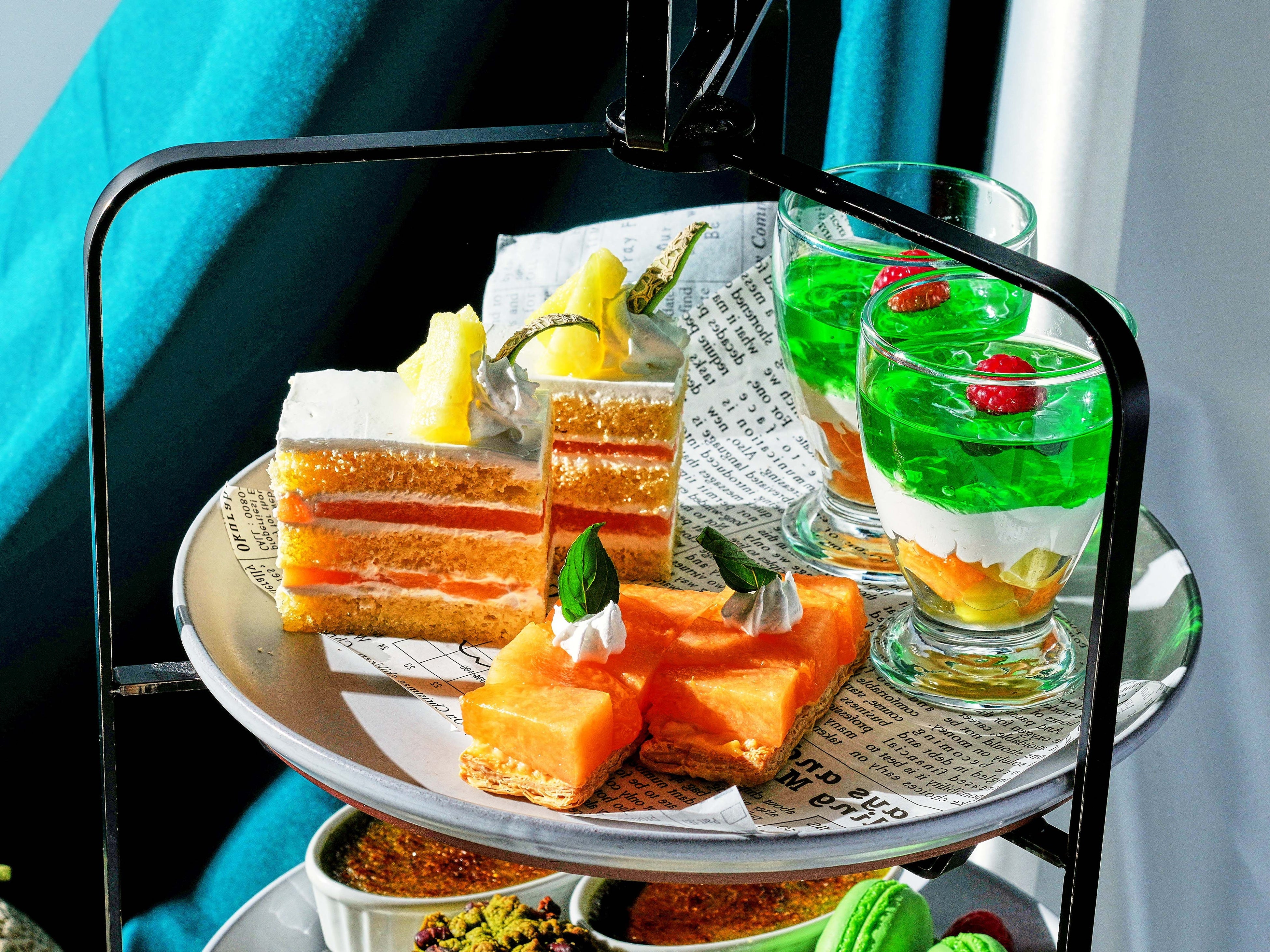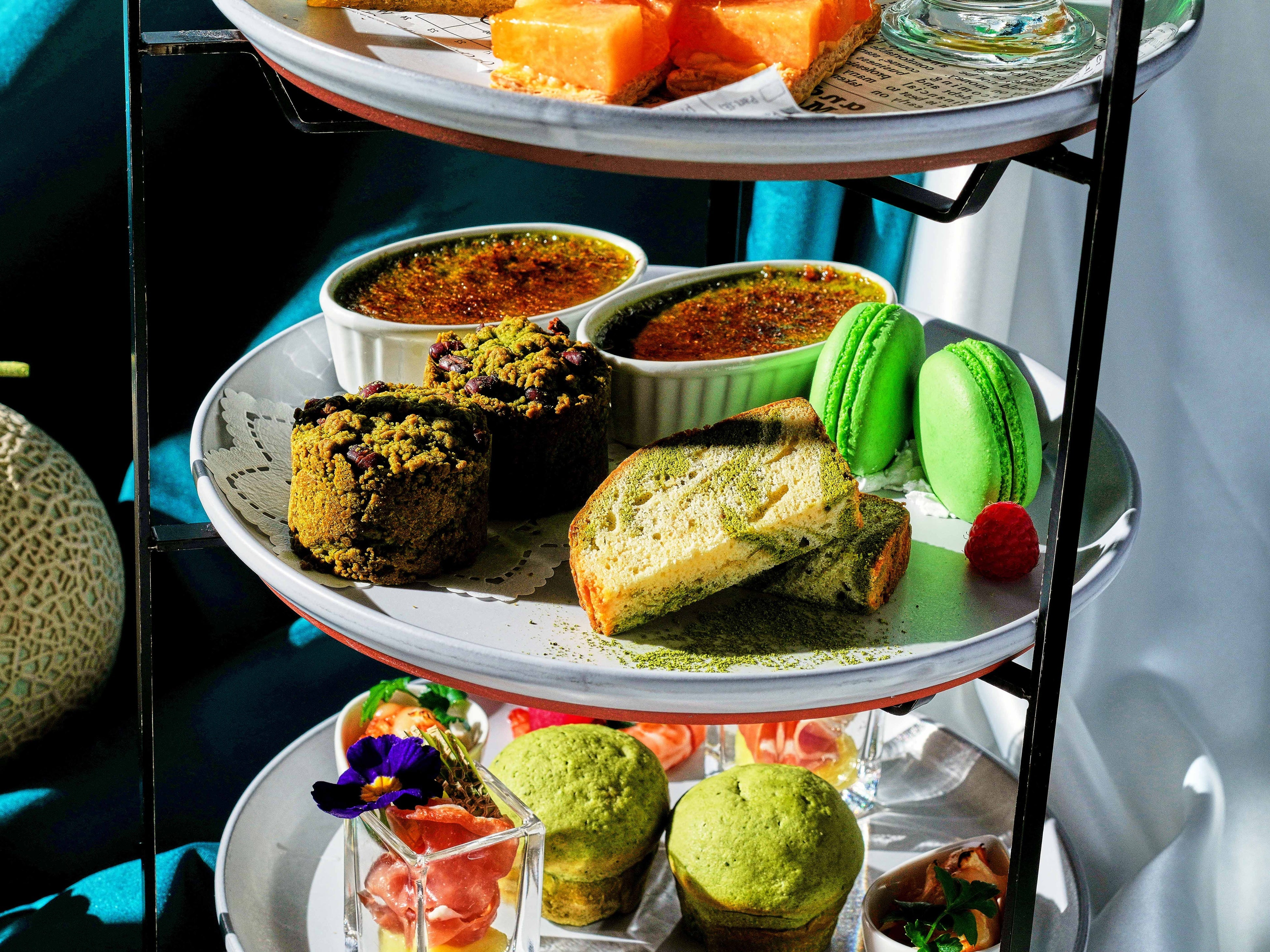 上段には、サクサク食感のメロンの一口パイや、メロンの香りとクリームチーズのコクがクセになるメロンとクリームチーズのミニパルフェなど、旬のメロンの甘みを楽しむスイーツを。中段には、綺麗なマーブル模様を出せるよう、絶妙な配分で抹茶を混ぜて焼き上げたふわりと広がる抹茶の風味が上品な味わいの抹茶のマーブルパウンドケーキや、生クリームと抹茶をふんだんに使用したなめらかなクリームと、サトウキビ100%のハチミツやバニラのような独特の香りと味わい深い甘さが特徴の砂糖・カソナードの香りを楽しめる抹茶のブリュレなど、パティシエこだわりのデザートが満載。