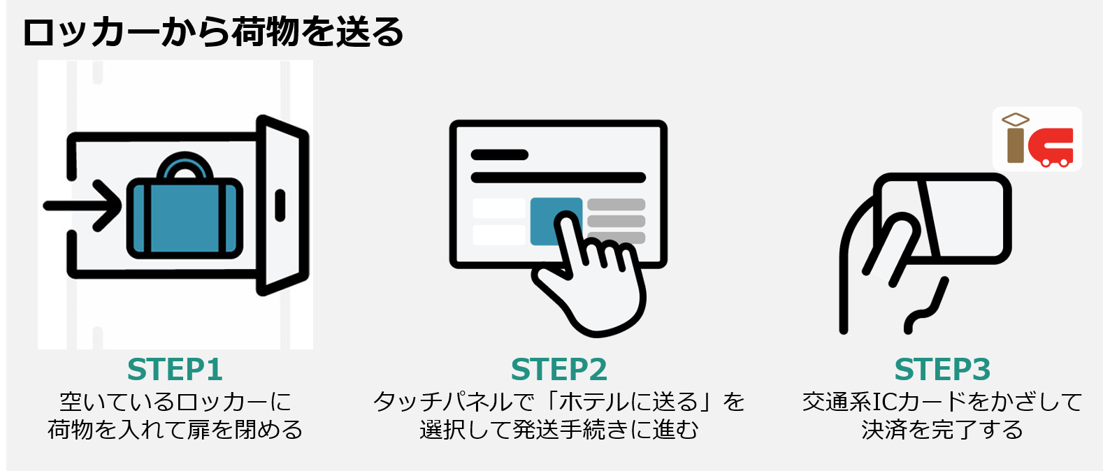 宿泊施設への配送は、ロッカーに配送したい手荷物を入れた後、スマートロッカーSPACER備え付けのタッチパネルを操作するだけで、完全に無人で受付できます。