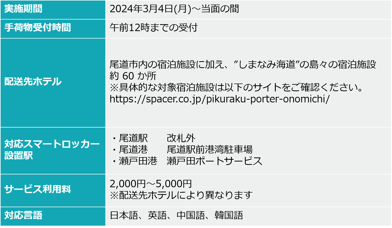 株式会社SPACER(本社:東京都中央区、代表取締役社長:田中章仁)は、西日本旅客鉄道株式会社(本社:大阪市北区、社長:長谷川一明、以下「JR西日本」)、と協業し、2024年3月4日(月)から尾道エリアで、2024年3月30日(土)から大阪エリアで、JR西日本沿線の駅などに設置されたスマートロッカーを用いた、手荷物の宿泊先のホテルへの配送サービス、「pikuraku PORTER(ピクラクポーター)https://spacer.co.jp/pikuraku-porter/onomichi」 の実証実験を開始します。