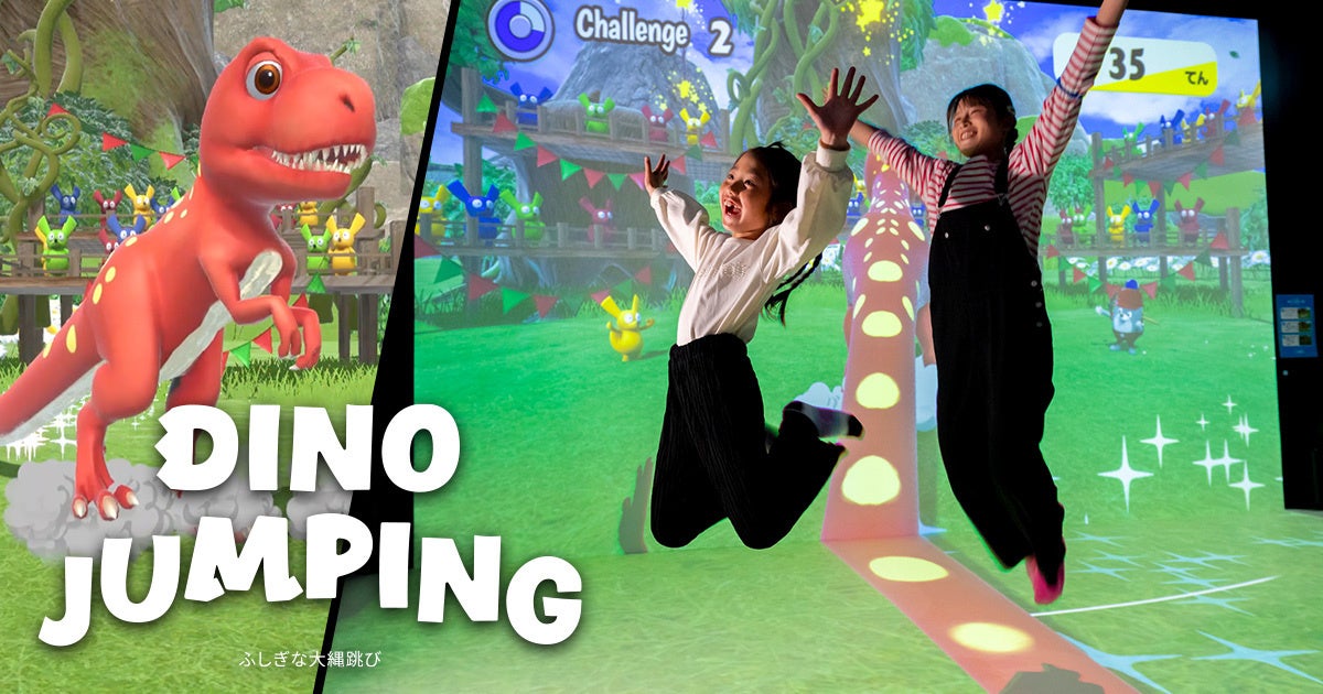 このたび大阪府和泉市、埼玉県越谷市の2パークで先行スタートした「DINO JUMPING」は、スクリーンに登場するティラノサウルスのシッポを“大縄跳び”のようにジャンプでよけて楽しむ、“集団×運動遊び”型の新アトラクションです。