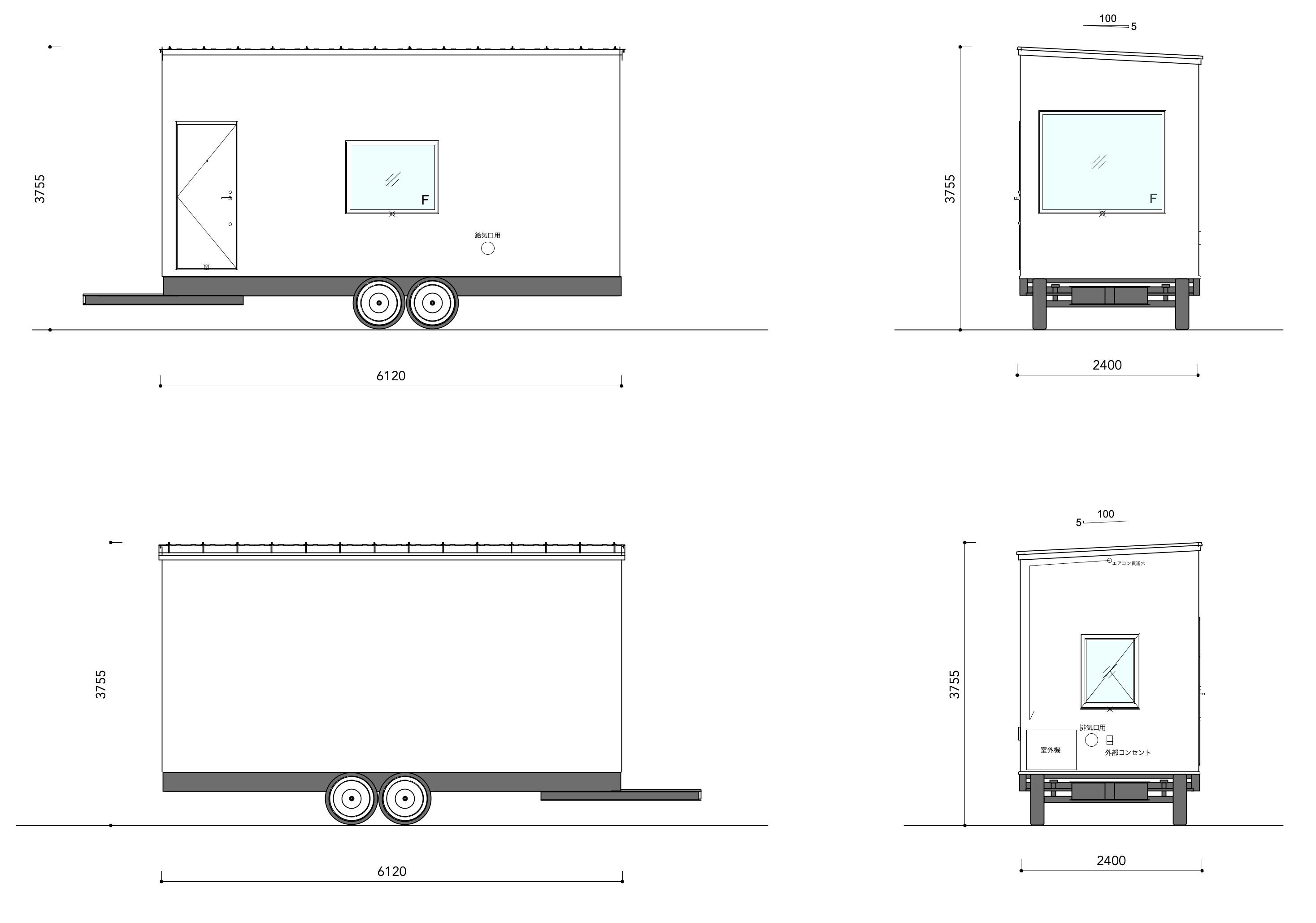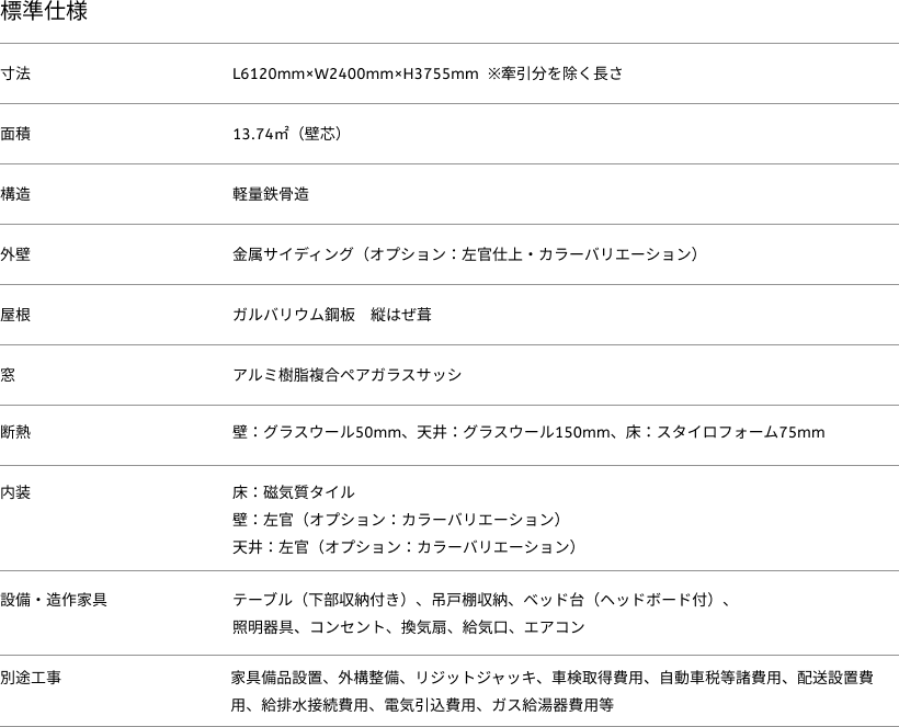 建築物ではなく車両であるため、税金や建築条件上でのメリットがある他、移設して再利用することも可能です。インフラの引き込みも可能なため、一般の建築物と同様に快適かつ多用途に使用することができます。