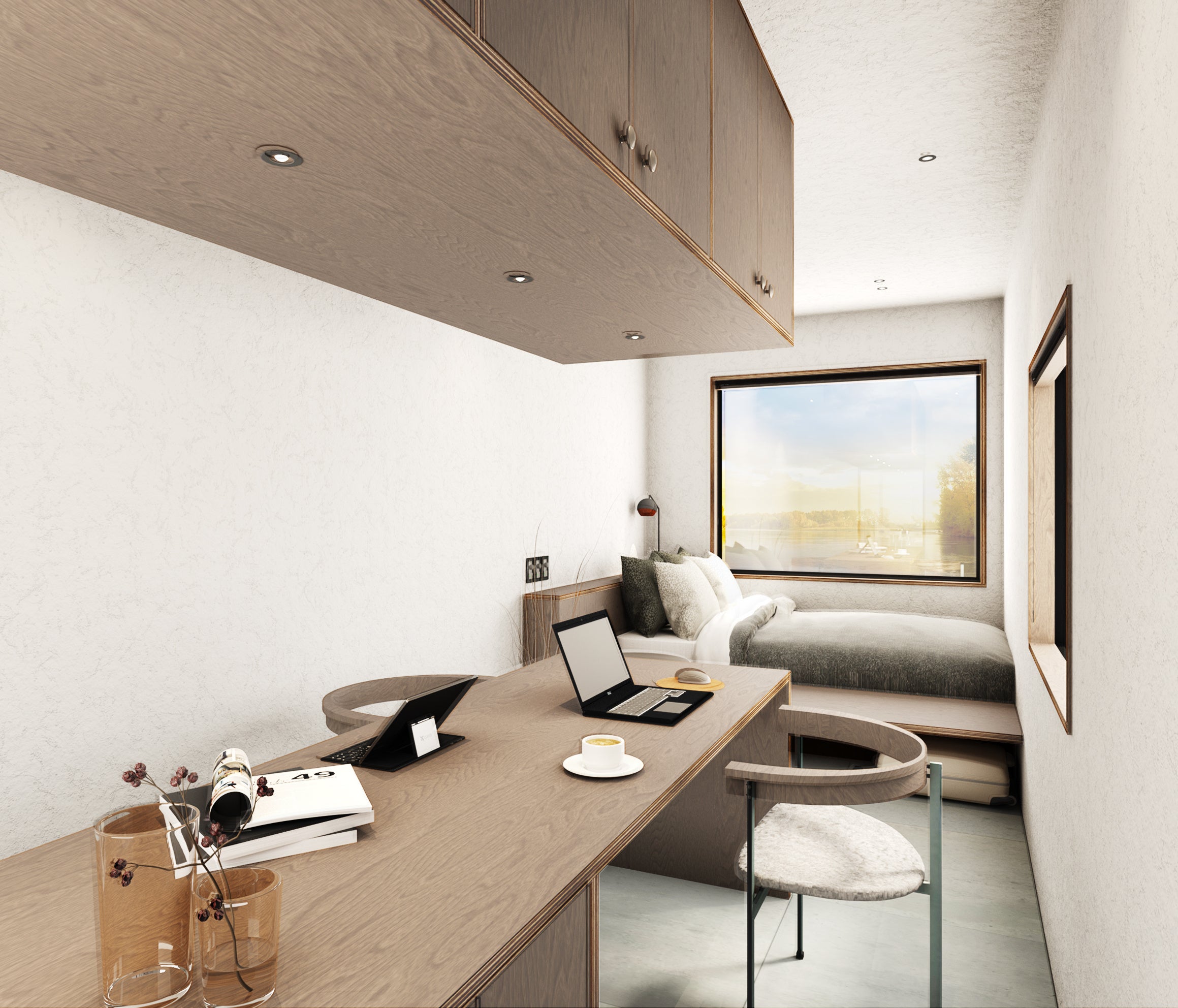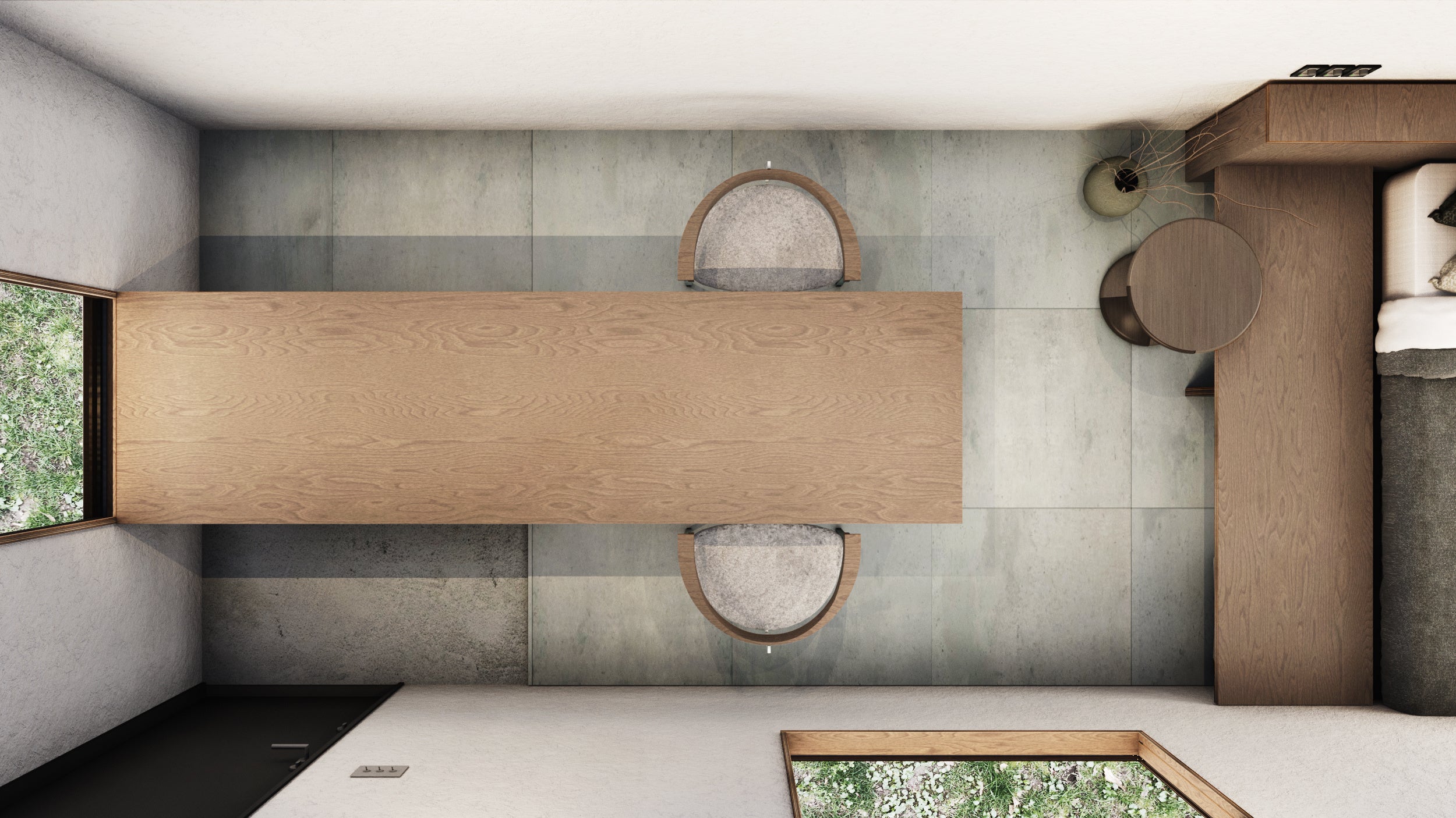 「WABLE」という名前には、仕事(Work)と暮らしの可能性(Able)を拡げる、新しいテーブル(Table)という意味が込められています。その名の通り、仕事に集中できる大きなテーブルと、暮らしの快適さを兼ね備えたベッドスペースの共存による、ワークスペースとホテルが融合したような空間が特徴です。