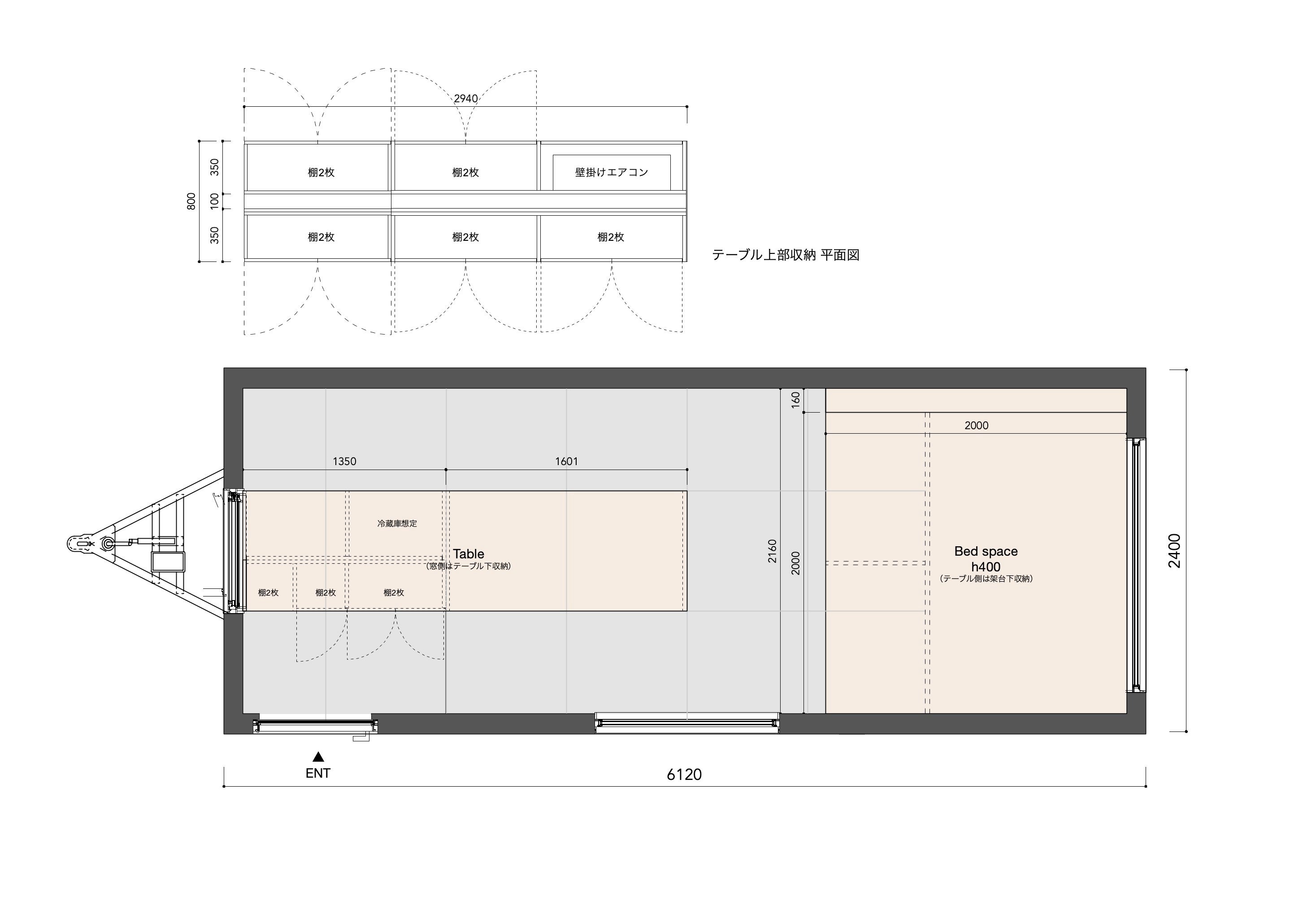 トレーラーハウスは、屋内幅が2200mm程度。実はテーブルを挟むとちょうど対面利用が可能な寸法となっています。一人での利用はもちろん、複数人の打ち合わせでテーブルを囲んだり、テーブルの両端で異なる作業を並行したり。テーブルが真ん中に配置してあるからこそ、多様な使い方を、あらゆる形で受け止めることが可能です。