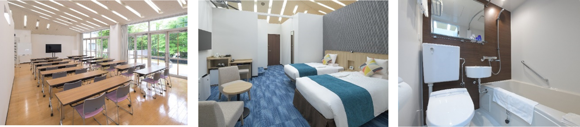 「成田・ホスピタリティ・アカデミー」は、独自のプログラムを実現するため、ホテルの洋室、 和室を再現したモックアップルームを完備しています。また、冷暖房・ミニ冷蔵庫・トイレ・バ ス・Wi-Fi 完備のお部屋は 1 人 1 部屋の個室利用のため衛生的で安心です。その他施設内にはラン ドリールーム、庭園には実習生同士のコミュニケーションを深めることができる BBQ テラスを備 え、実習生が長期滞在でもプライバシーを守りながら快適に学習に集中できる環境が整っていま す。