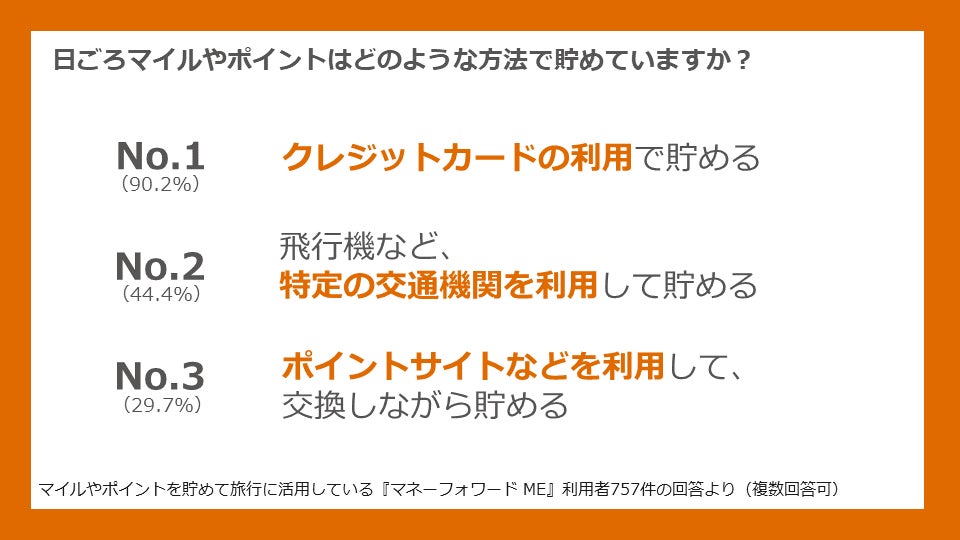 ・日々のマイルやポイントの貯め方は、第1位「クレジットカードの利用」、第2位「飛行機などの特定の交通機関の利用」、第3位「ポイントサイト等を活用して、マイルと交換」