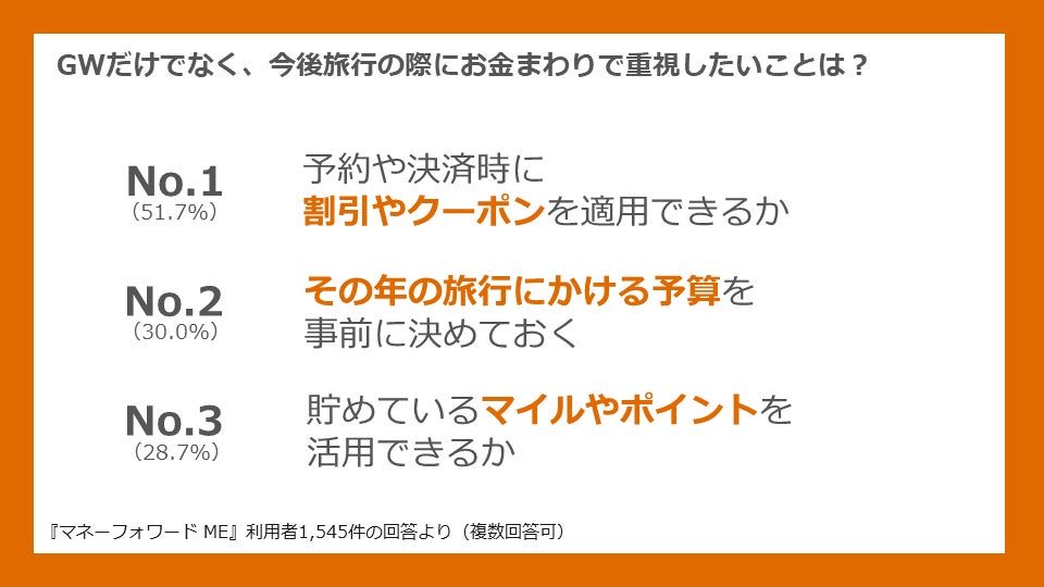 GWだけでなく今後の旅行で、お金まわりで重視したいこととして「予約や決済時に割引やクーポンを適用できるか(51.7%)」がトップに。事前に旅行に割く予算を決めることや、マイルやポイントというキーワードも挙がり、いかにお得に賢く旅をするかという考えも強くなっていそうです。