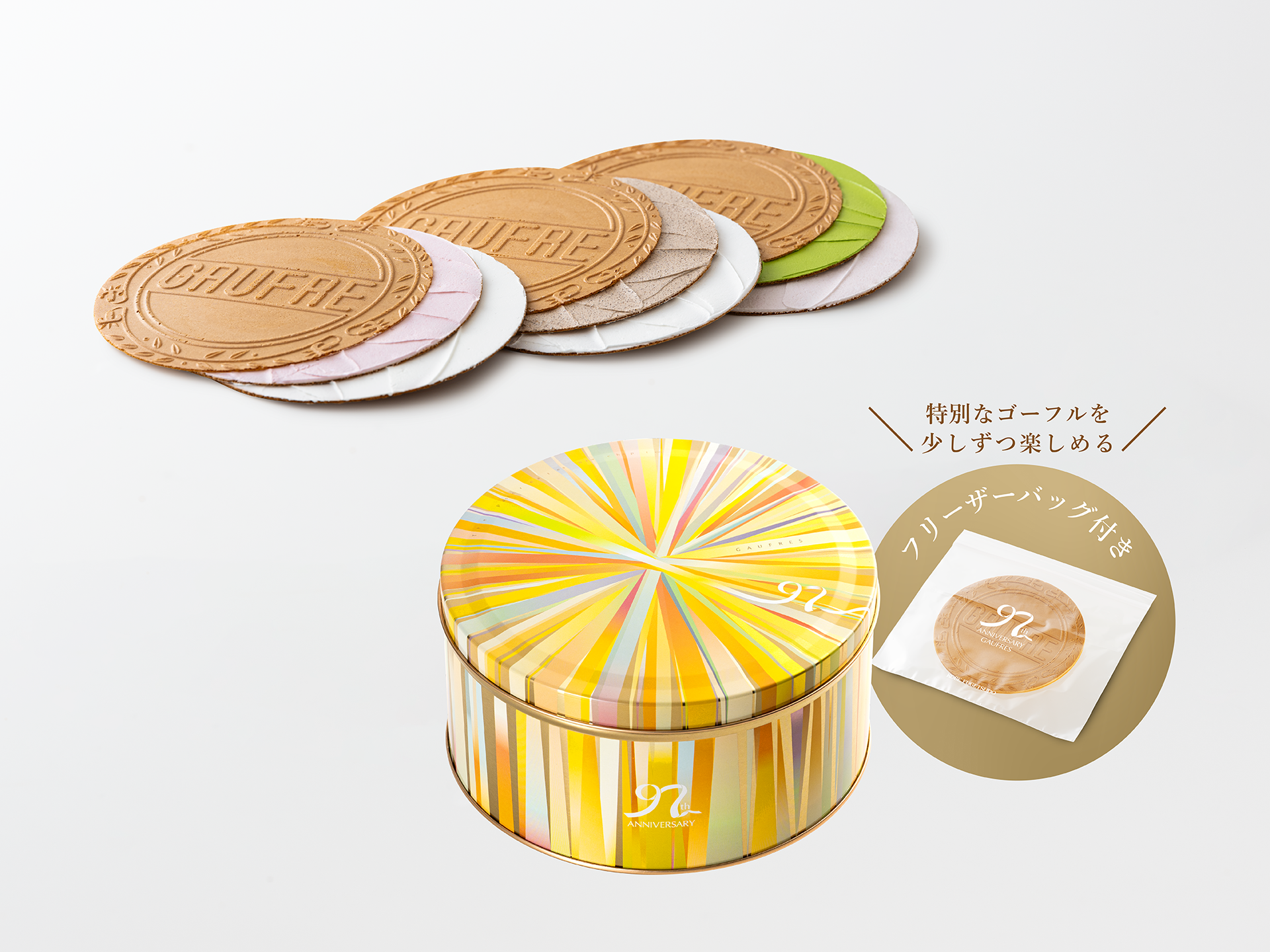 オリジナルデザイン缶の中には、97周年アニバーサリー企画のために開発された特別なゴーフルをアソートしました。
