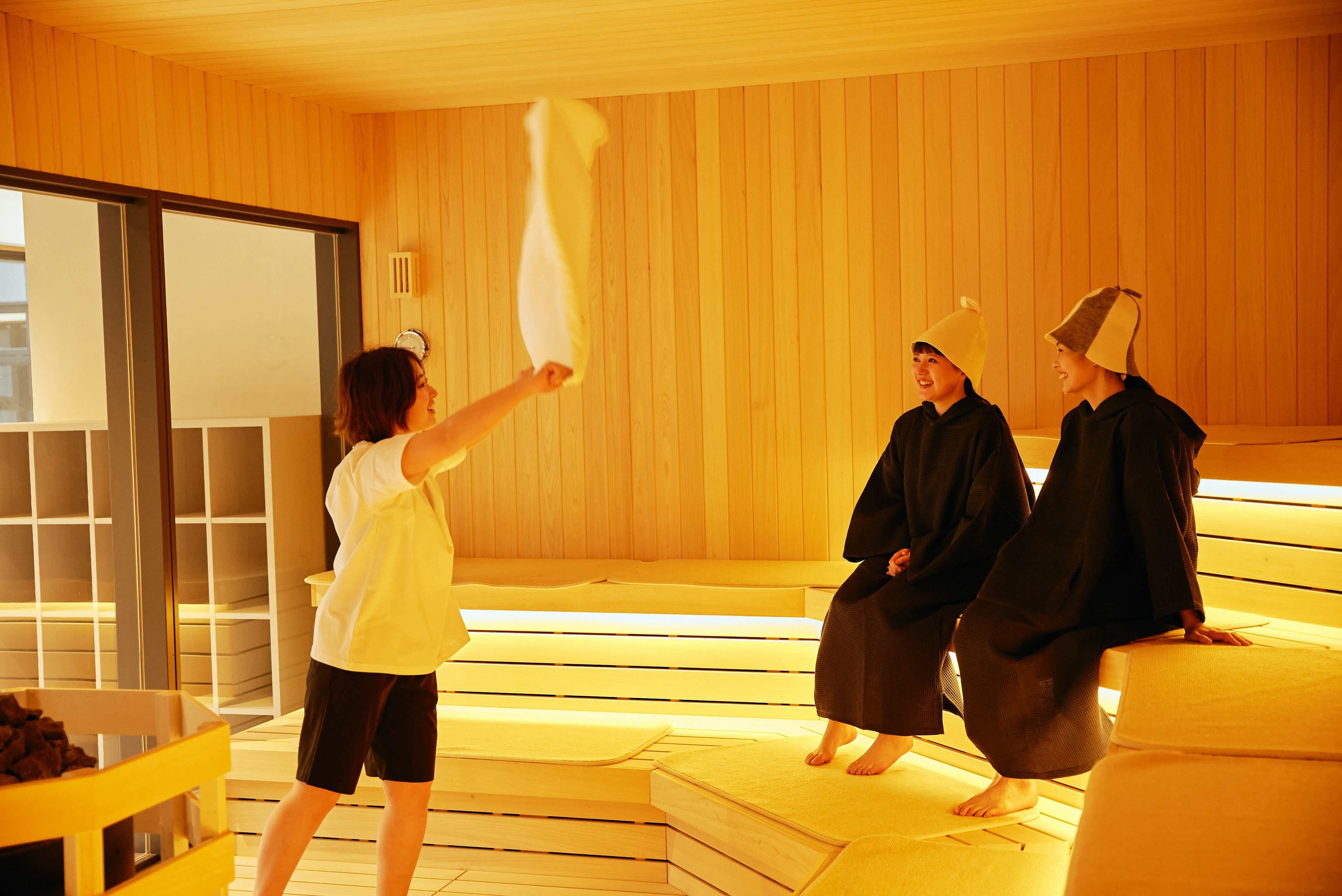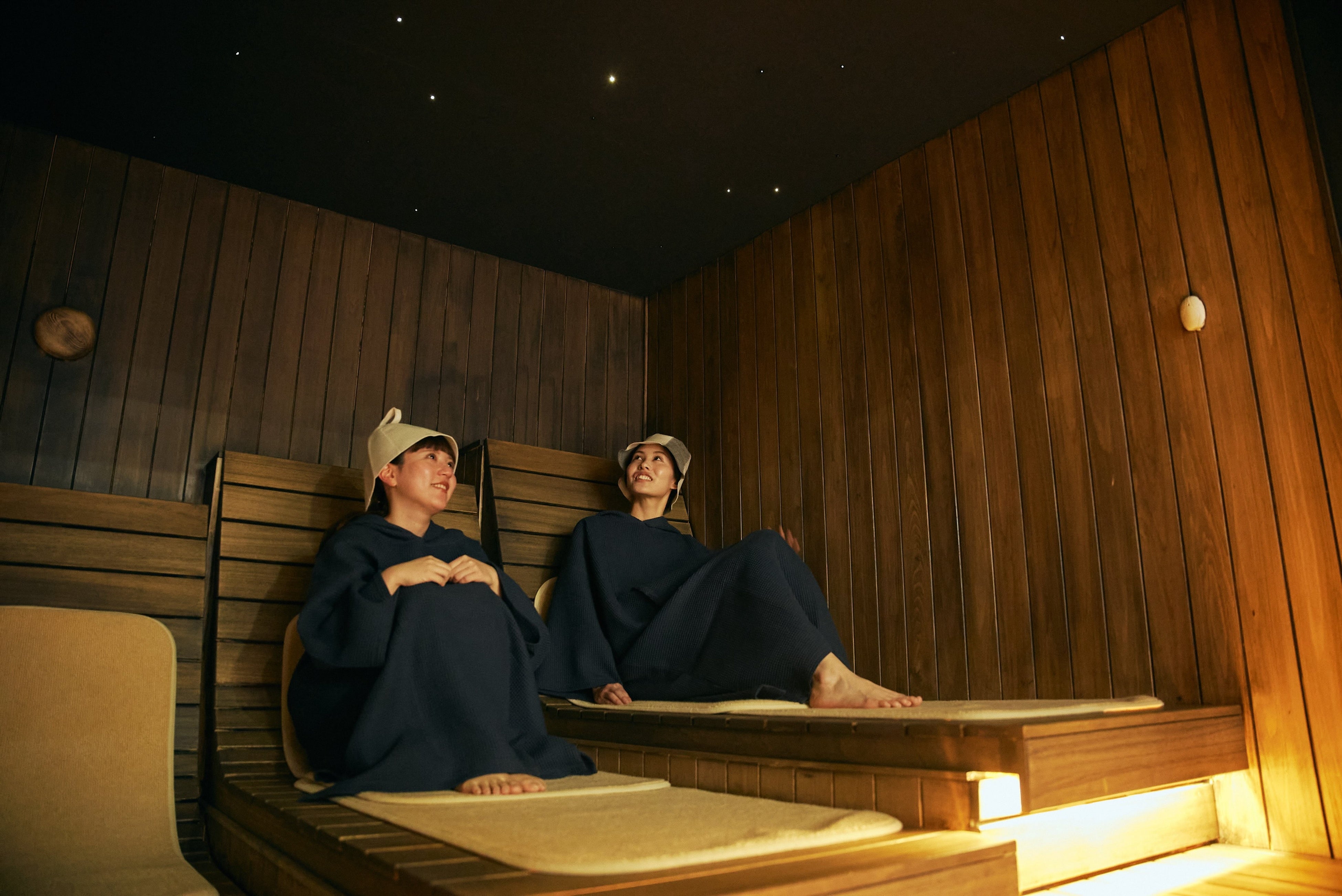 本館別棟の有料サウナエリア。北欧のサウナの楽しみ方から着想を得た3種類のサウナを、水着着用で男女一緒に楽しむことができます。中庭デッキでは、外気浴や井戸水を使った水風呂も。屋内のラウンジエリアでは、内気浴やフリードリンク、書籍などをゆったりとお楽しみいただけます。