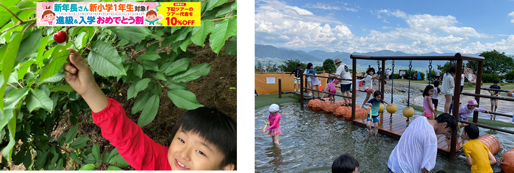 実施内容:おいしいさくらんぼの見分け方講座、さくらんぼ狩り、ウォーターアスレチック体験など