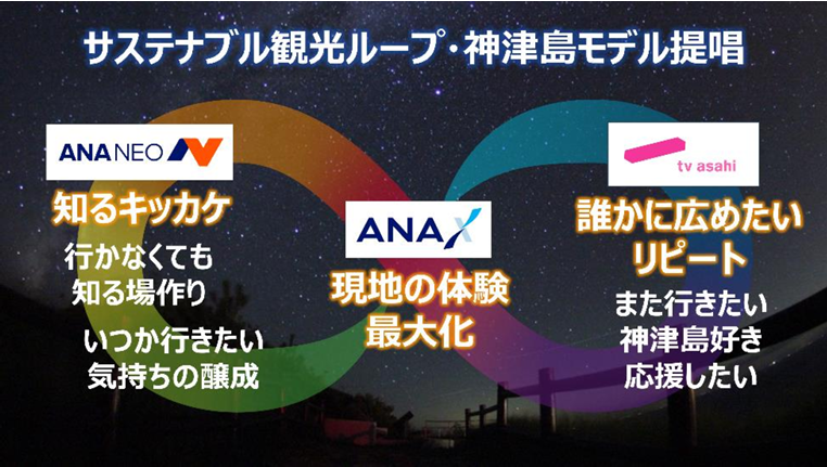 そこで今回、NTT東日本が全体コーディネートを担い、観光客に対し強いアプローチ力をもつANA NEO とANA X、およびコンシューマ向けのコミュニケーションに長けているテレビ朝日を加えた異業種4者がパートナーとなり、日本で2番目の星空保護区であり、日本初となる「ダークスカイ・アイランド認定*3」を受けた神津島村において、観光分野で新たに3つの取り組みを展開することになりました。