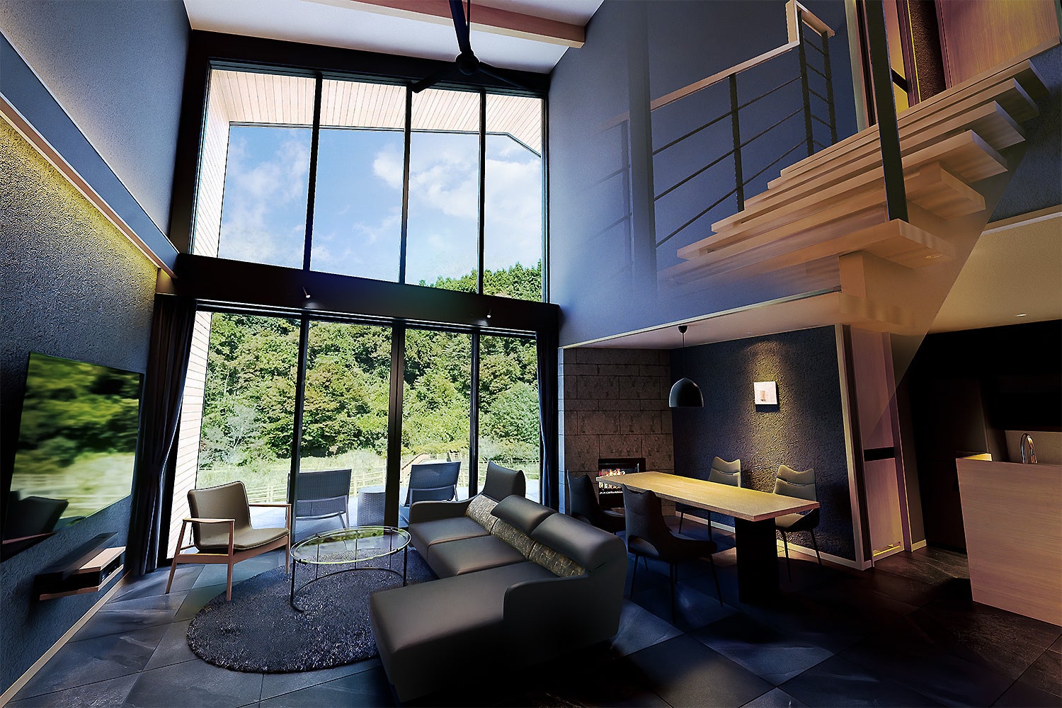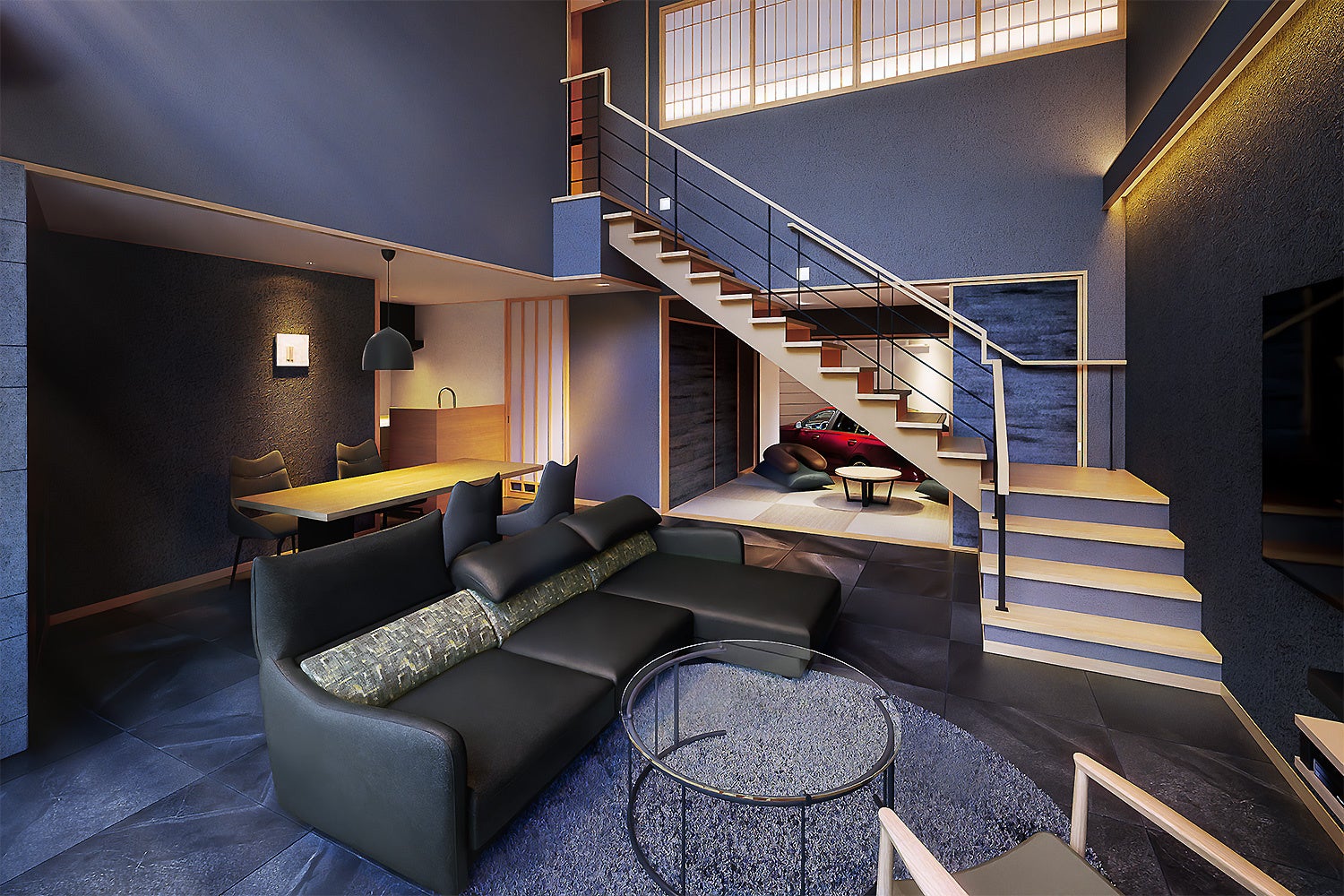 完全独立型のヴィラはメゾネットタイプで、200㎡の広さを誇るゆったりとした間取り。モダン和風のインテリアで統一されたリビングは解放感あふれる吹き抜けで、フロアに続く和室からはガラス越しにガレージに停めた愛車がショールームのようにご覧いただけます!2階まで届く大きな窓の向こうに広がる箒川のせせらぎと上塩原の四季の景色に心洗われるひとときをお楽しみください。