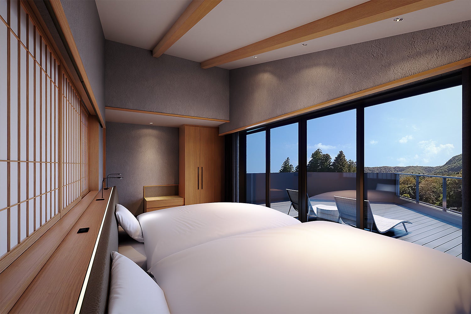 お客様から感動の声をいただく上塩原自慢の星空の美しさをプライベートな空間で楽しんでいただきたいー。そんな想いから生まれたのが寝室から続く屋外空間、“星見テラス”。1Fのリビングダイニングに匹敵する贅沢な広さのテラスは、星空観察はもちろん、読書やお昼寝、BBQやサウナの“ととのい場” など、自由自在に活用できる滞在中のアウトドアラウンジ。星空観察用の天体望遠鏡は、フロントにて貸出もいたします。春夏秋冬、季節の移ろいを肌で感じて過ごすここだけの『紅葉 KUREHA』時間をお過ごしください。