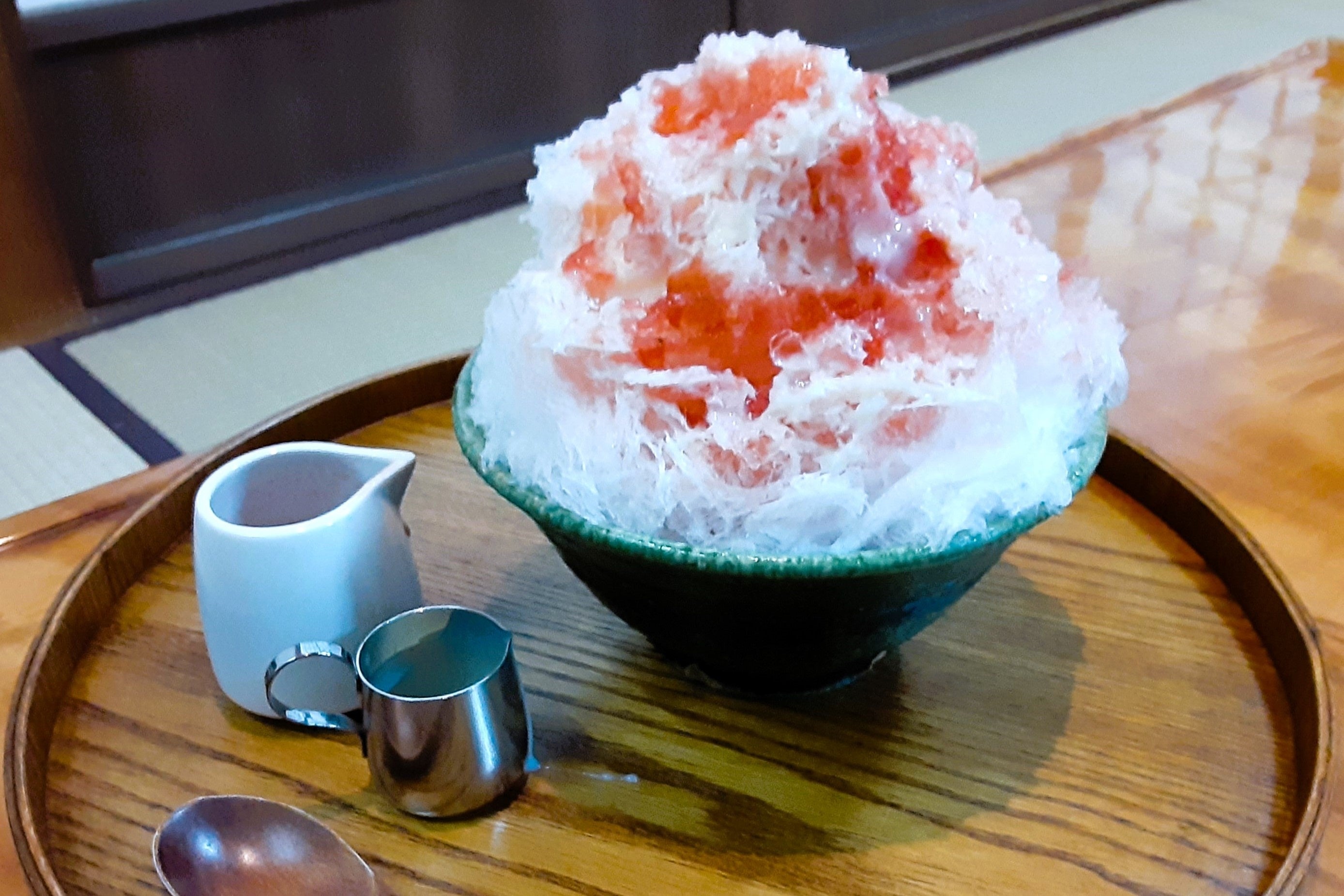 秩父札所・観音院の門前にある観音茶屋での昼食は『観音そばと鬼ころり膳』。古式手打のばと鬼もコロリと参ったと言う名物を味わった後は、毘沙門水で作ったかき氷に地元産のシロップをかけた『毘沙門氷』を味わいます。