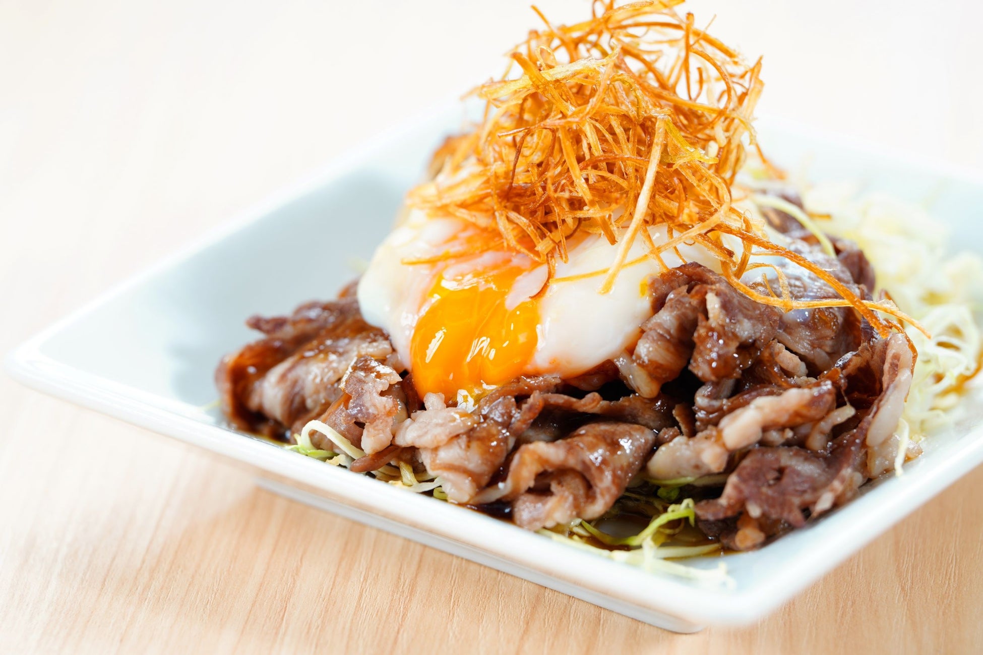 メイン料理の「黒毛和牛ローストビーフ」は、上質なお肉をじっくり焼き上げて、旨味たっぷり赤ワインソースまたはさっぱりしたポン酢オニオンソースをお好みでお召し上がりいただきます。おすすめ魚料理「シーフード鉄板焼き」は、ホタテ、海老、サーモン、烏賊に、甲殻類独特の甘みとコクが堪能できるアメリケーヌソースを合わせてお楽しみいただきます。その他にも、国産牛リブロースを甘辛いタレでからめて、とろ~り温泉卵をのせた「牛すき温玉のせ」、王道サーモン、コハダなどの「握り寿司4種」など、ボリューム満点な品揃えでご用意いたします。