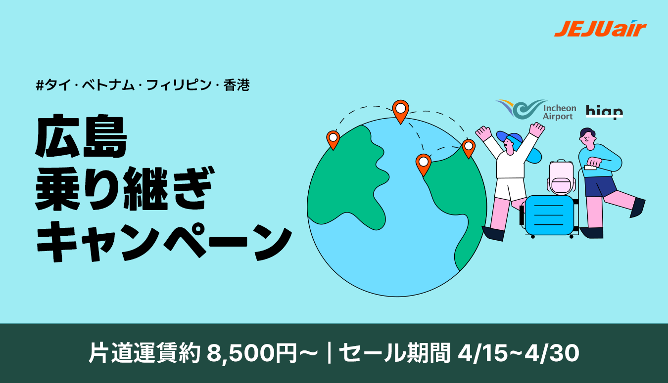 チェジュ航空は4月30日まで、広島を出発して仁川国際空港を経由し、フィリピン・ベトナム・タイ・香港などを旅行する顧客を対象に、最大90%割引の価格である片道運賃約8,500円から航空券を販売する「広島乗り継ぎキャンペーン」を行う。 搭乗日を基準に5月1日から10月26日まで利用でき、チェジュ航空の公式ホームページ(www.jejuair.net)とモバイルアプリ、モバイルウェブのみ予約できる。