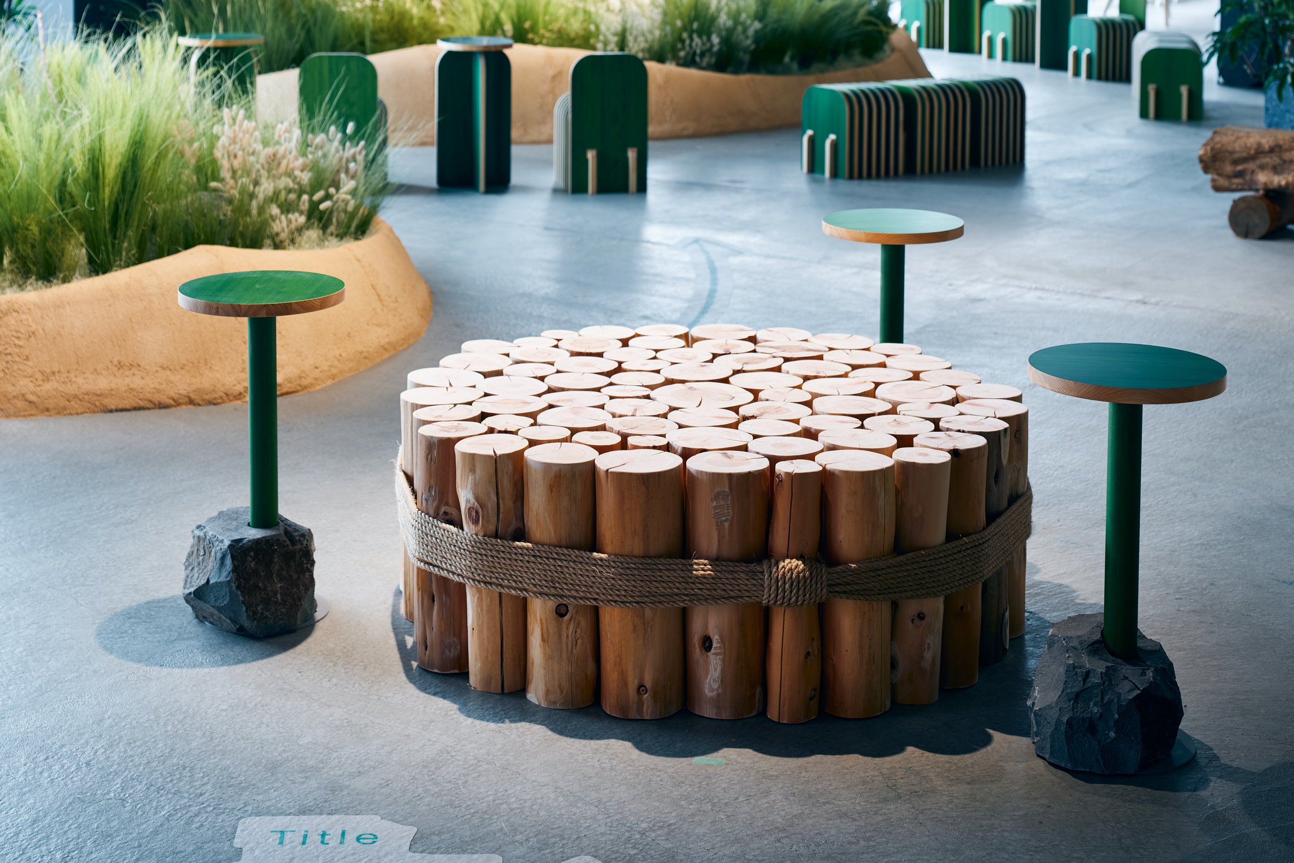 造作什器については、西粟倉の間伐材を使用した組み立て式のオリジナル什器を開発しています。その他、多摩産材の間伐材の丸太を束にしたベンチや、古着を圧縮したソフトなボードを束ねたベンチなど、環境に配慮された素材を実際に触り使用することで、人々の意識を変えるきっかけを提供します。
