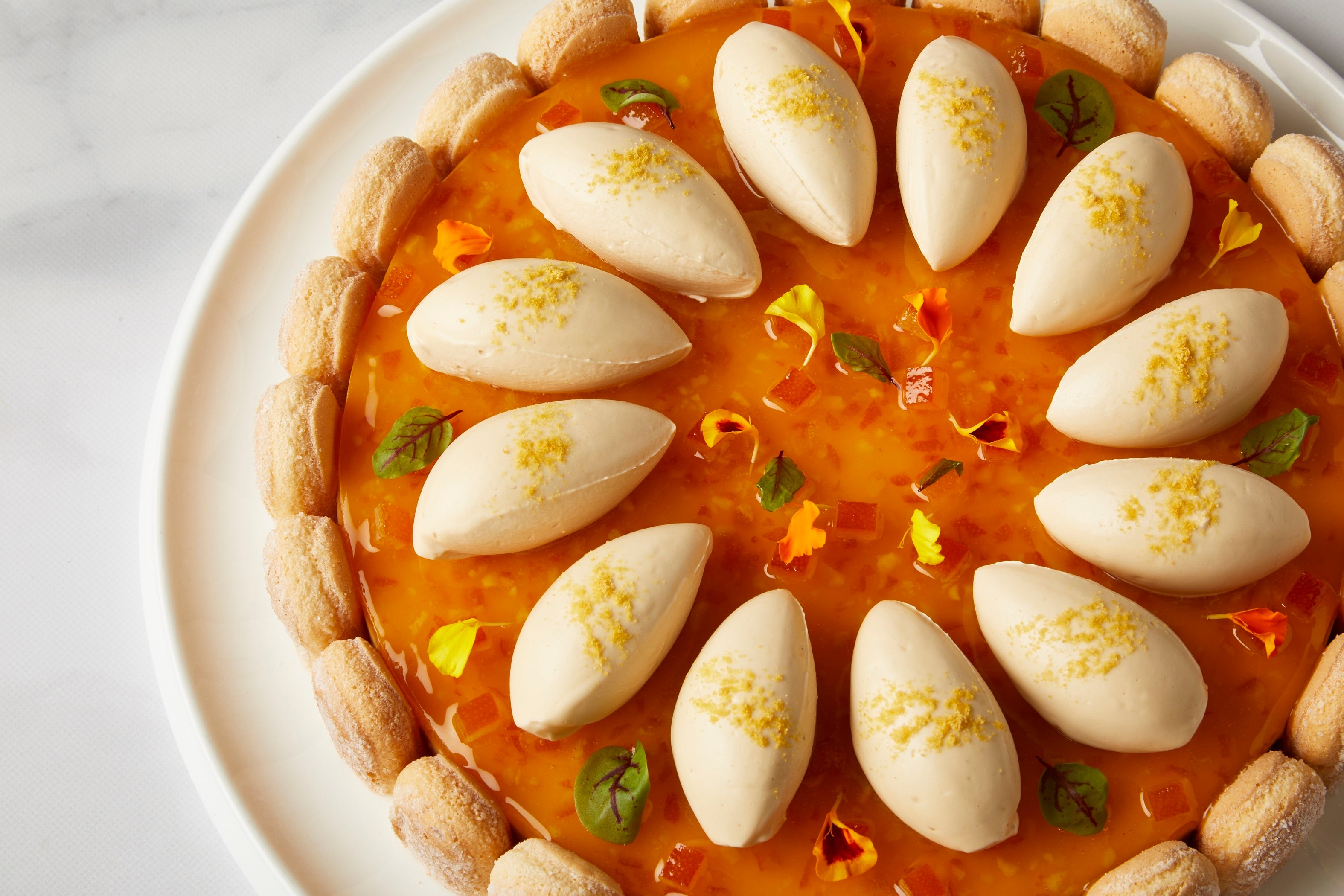 ヘーゼルナッツのパウダーを練りこんだクリームにカモミールのムースとオレンジゼリーを重ね、ブロンドチョコレートとフラワーウォーターのクリームを乗せたタルトです。爽やかな柑橘の酸味と花畑にいるような華やかな香りをご堪能いただけます。