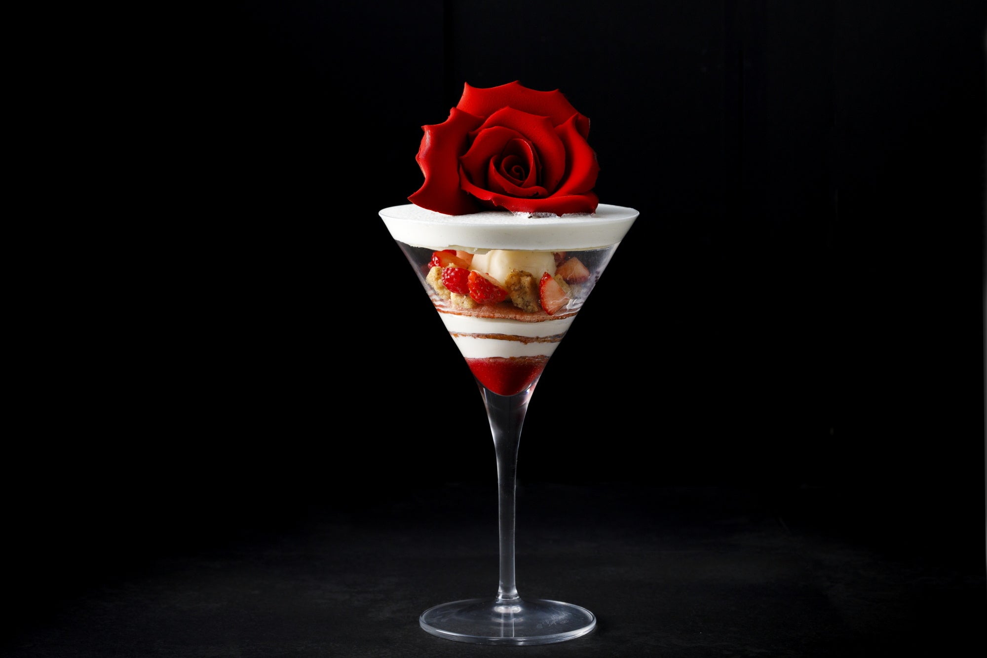 フランボワーズソース、いちごシロップをしみこませたビスキュイに、はちみつ、オリジナルのティラミスクリームをそれぞれレイヤー状に配置。グラスの縁を覆うホワイトチョコレートで蓋の上には、絞ったティラミスクリームとチョコレート細工で仕上げた深紅のバラ飾りを添えています。