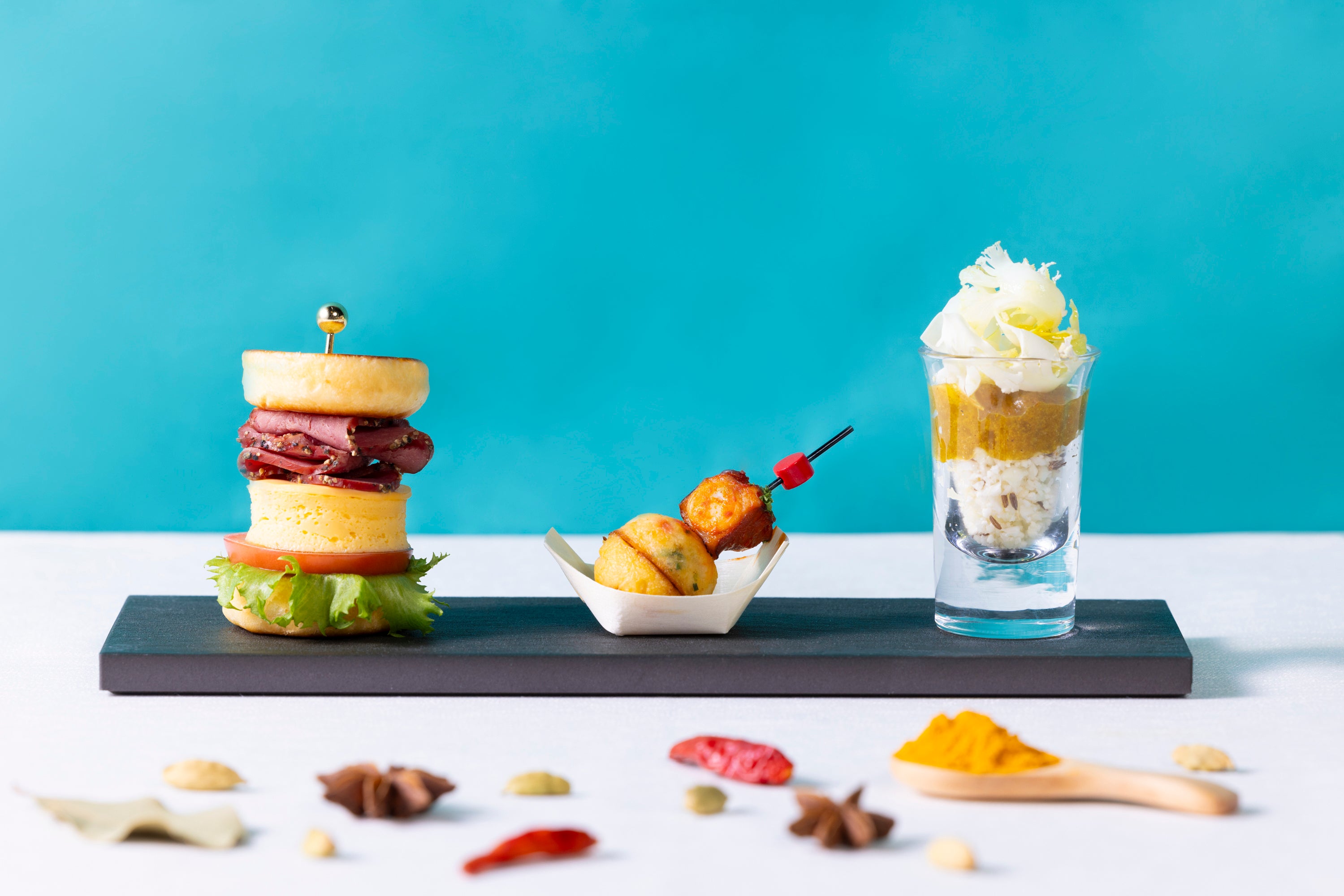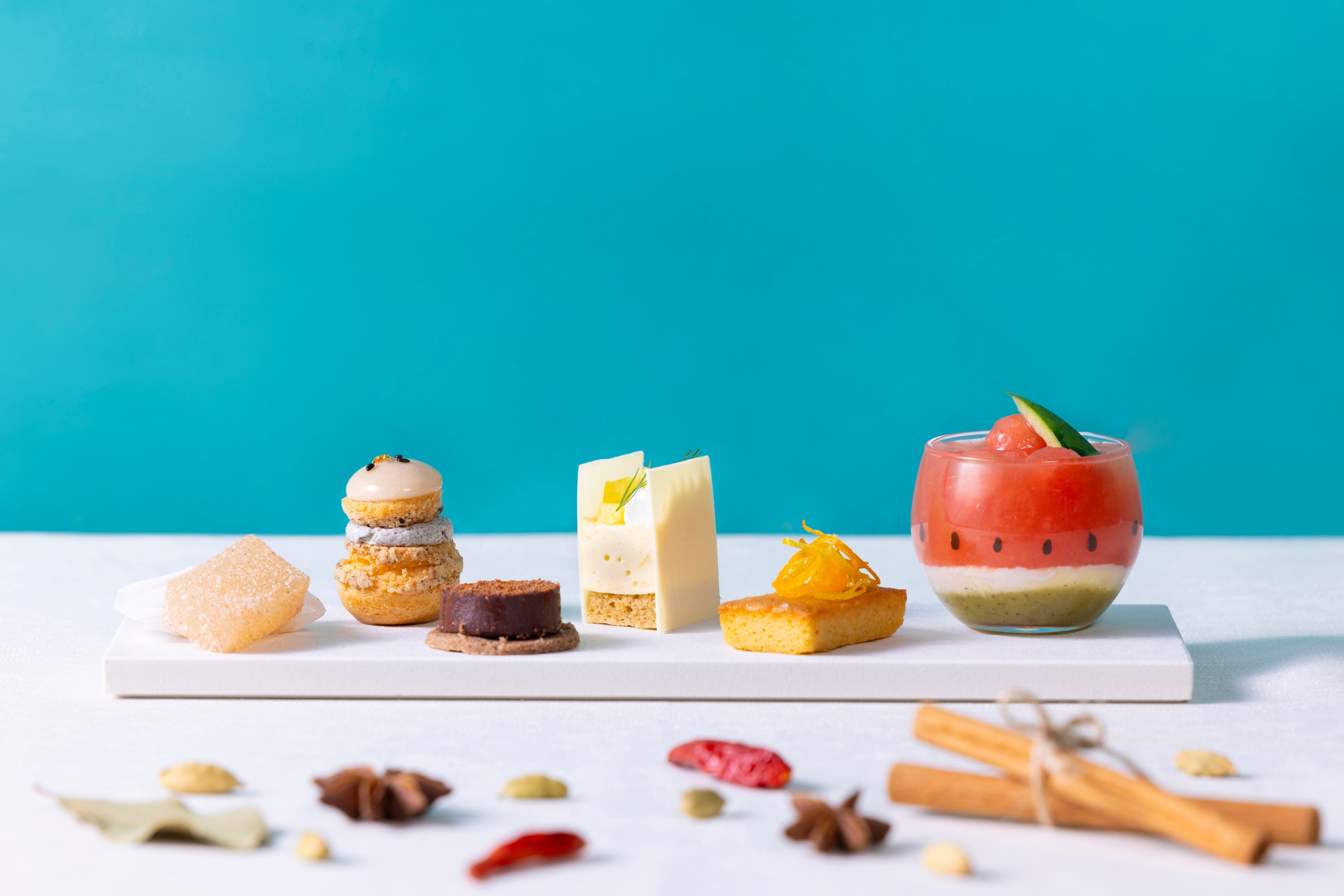 スパイスは「天然の薬」と呼ばれるほど(*2)、食欲増進、疲労回復、消化吸収促進、強壮、殺菌など健康維持に非常に役立っている(*3)と言われています。そこで、暑さで体調を崩しやすい夏にぴったりなスパイスを使用したスイーツとセイボリー、全10種を提供します。冷え性の防止に効く唐辛子を使用した「ショコラタルト」や、ビタミンとミネラルが豊富な大葉ジュレでスイカの皮の部分を表現した「スイカゼリー」の他、かつて薬を包むのに使用していた「薬包紙」に入れて提供する「パートドフリュイ」など、スパイスはもちろん、見た目も楽しいラインナップです。さらに、別添えで提供する「マンゴーパフェ」はお腹を温めてくれる山椒がアクセントになっており、トロピカルなフルーツとの相性も抜群です。セイボリーには、パプリカを使用したスペイン風たこ焼き「たこのトルティージャ」や、エスニックな香りで食欲をそそるクミンを使用した「カレー風カリフラワーサラダ」などが並びます。