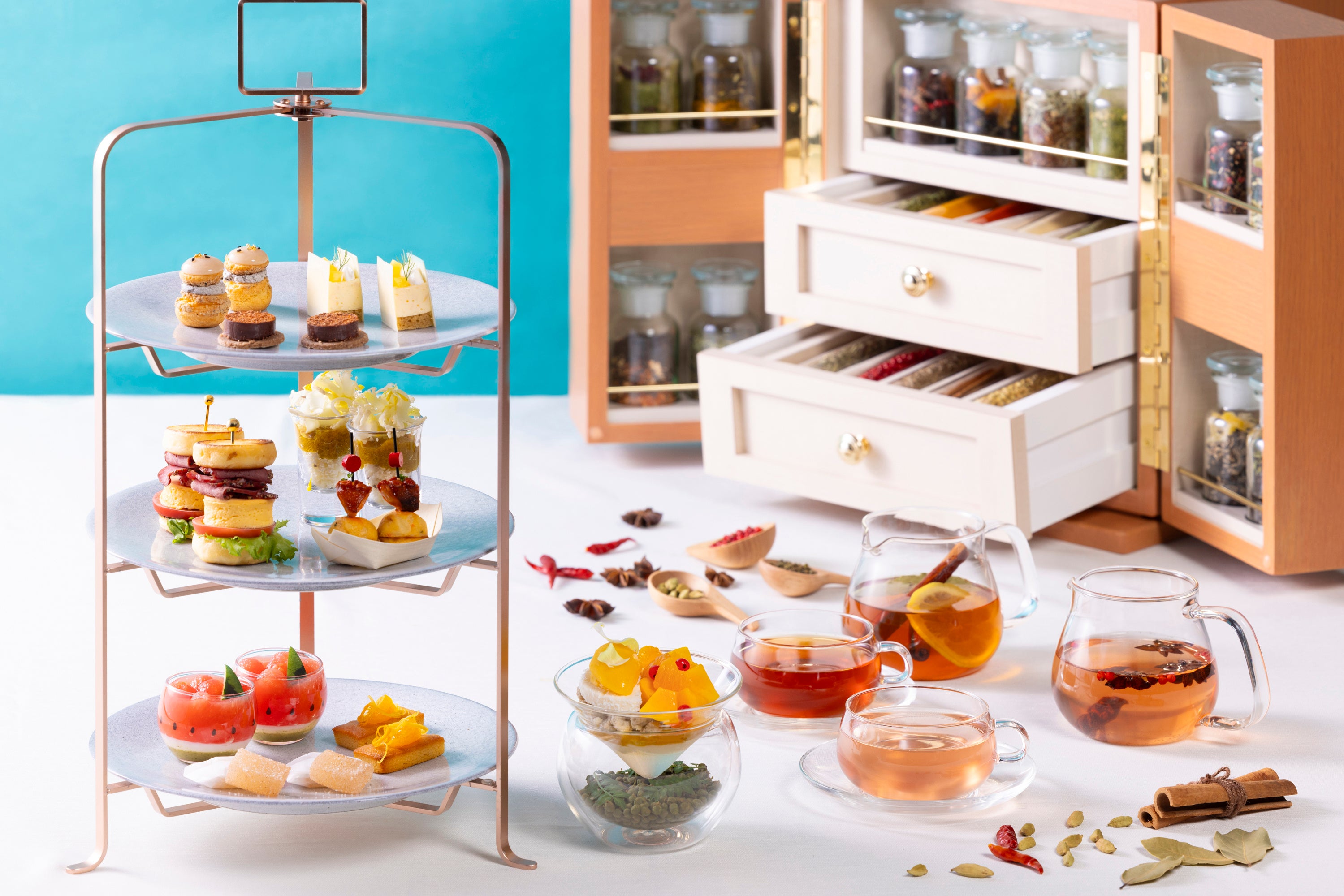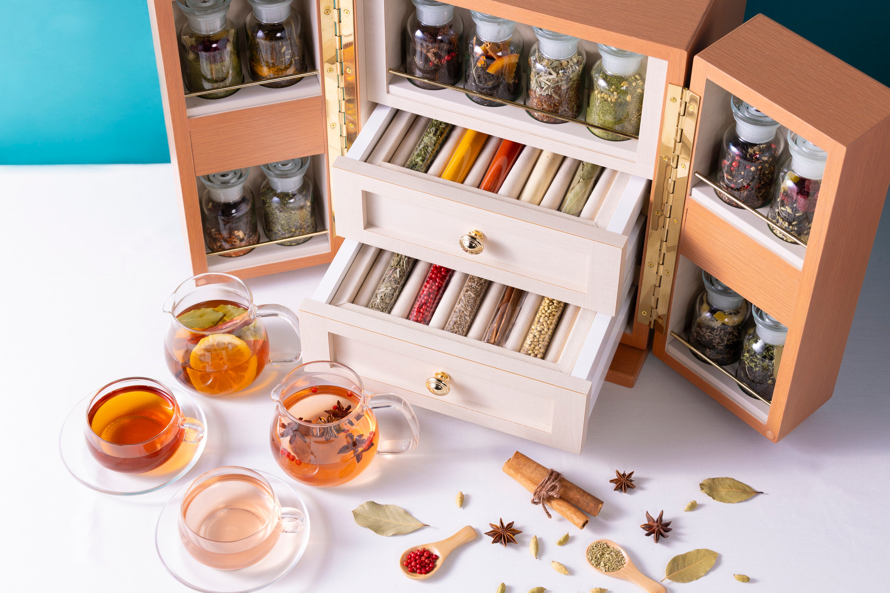 アフタヌーンティーに欠かせないドリンクには、ベースとなる茶葉にスパイスを加えたオリジナルスパイスティーを提供します。薬の歴史を振り返ると、医師が調剤用に使用していた薬箱は、多種多様な乾燥した薬用植物を収納、そして持ち運ぶ必要があったことから大型でした。そんなかつての薬箱をイメージし、オリジナルスパイスティーで使用するスパイスや茶葉をボックスに収納。香りをテイスティングして好みのスパイスティーを選べる楽しさもあり、充実したティータイムを過ごすことができます。