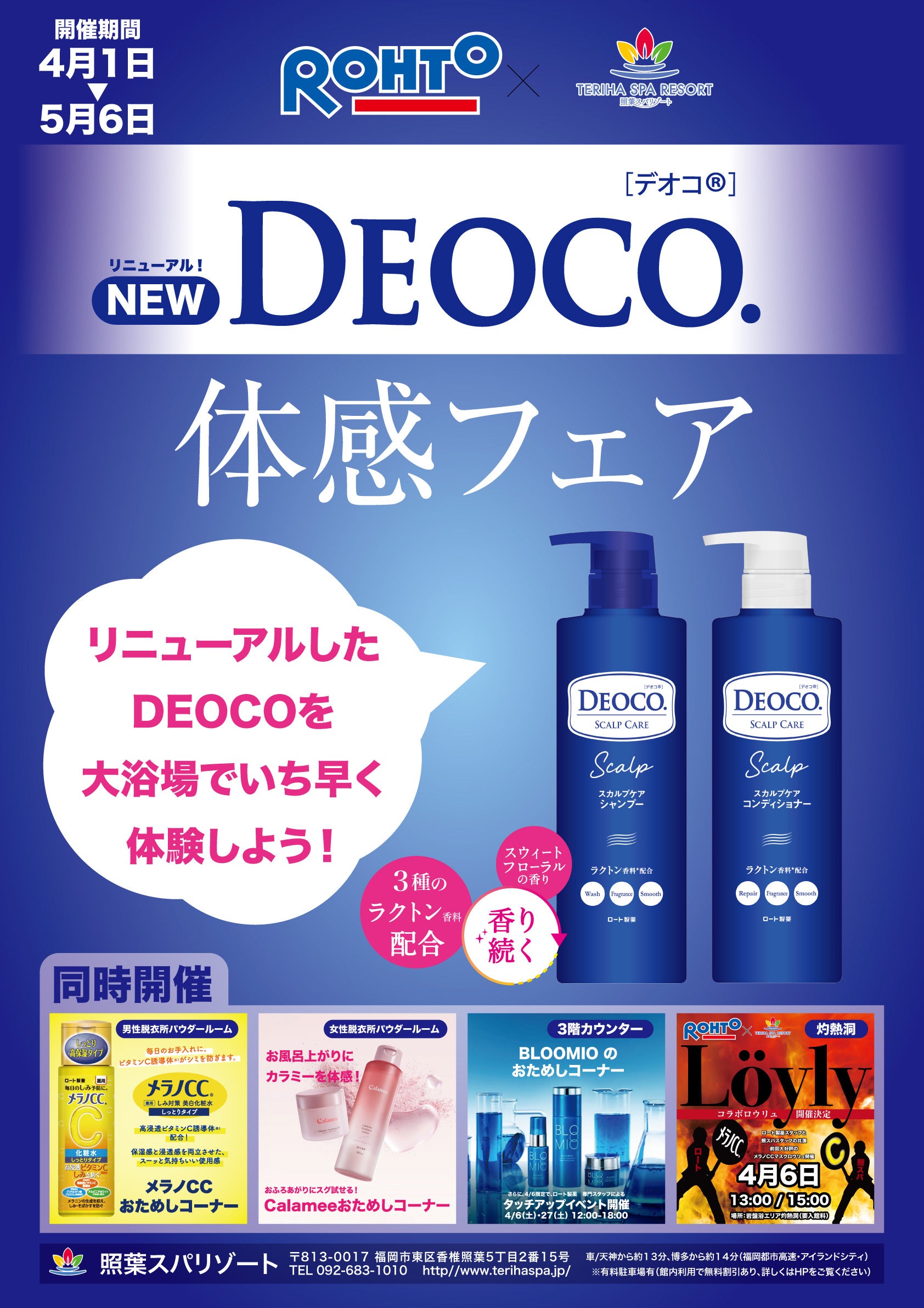 株式会社ナカシロは、福岡を代表する温浴複合施設、「照葉スパリゾート本店」と「照葉スパリゾート門司店」にて、5月6日まで、ロート製薬㈱が3月16日に3年ぶりにリニューアルした「デオコ」のヘアケアシリーズを浴室の洗い場に設置しお試し頂けるイベントを行っております。詳細は以下のとおりです。