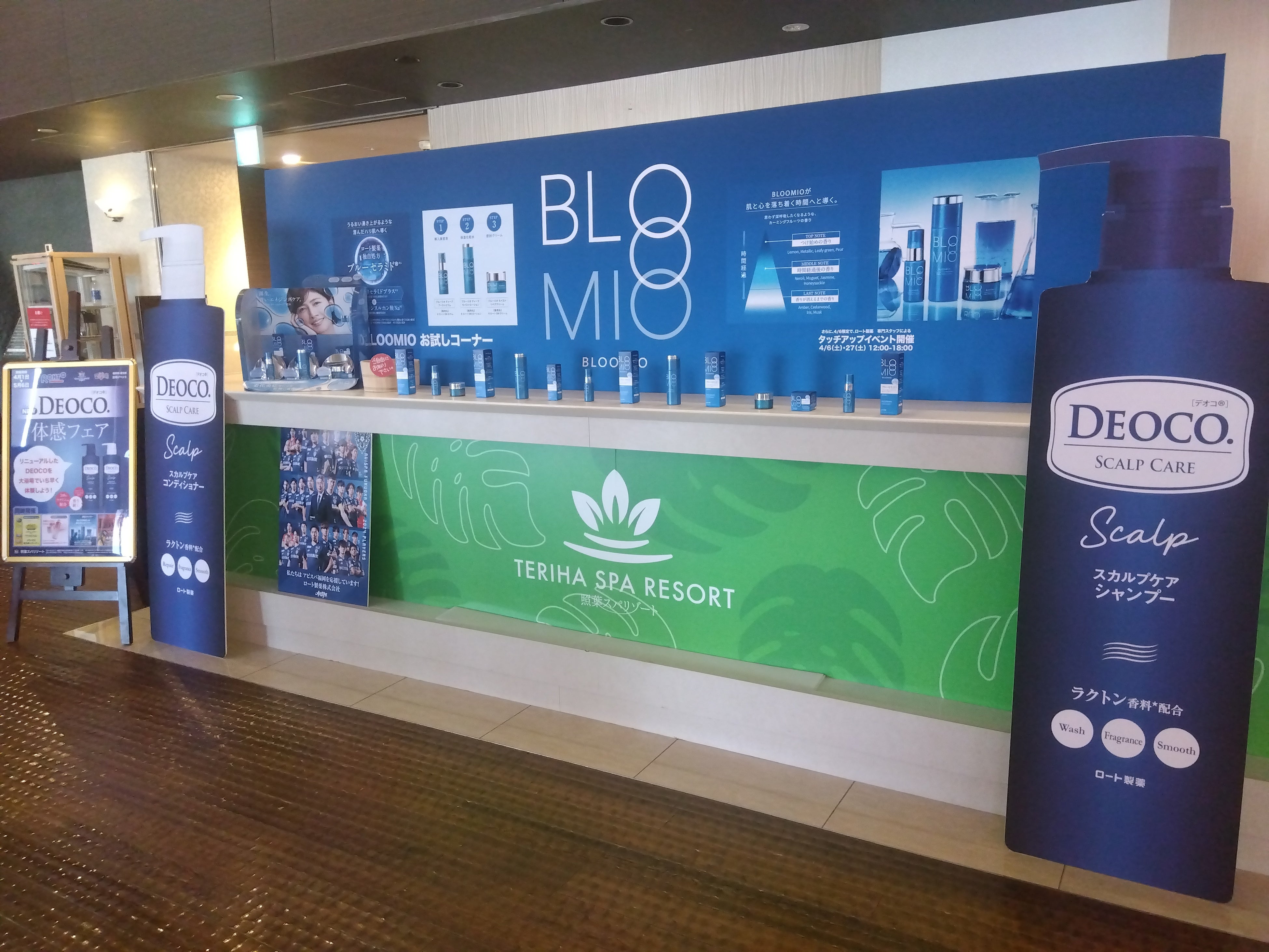 また、照葉スパリゾート本店では、機能性成分「ブルーセラミド®」配合した新スキンケアブランド「BLOOMIO(ブルーミオ®)」(化粧水・美容液・クリーム)の無料お試しコーナーも設置されています。4月27日(土)には、ロート製薬専門スタッフによるタッチアップイベントも12:00~18:00で開催。