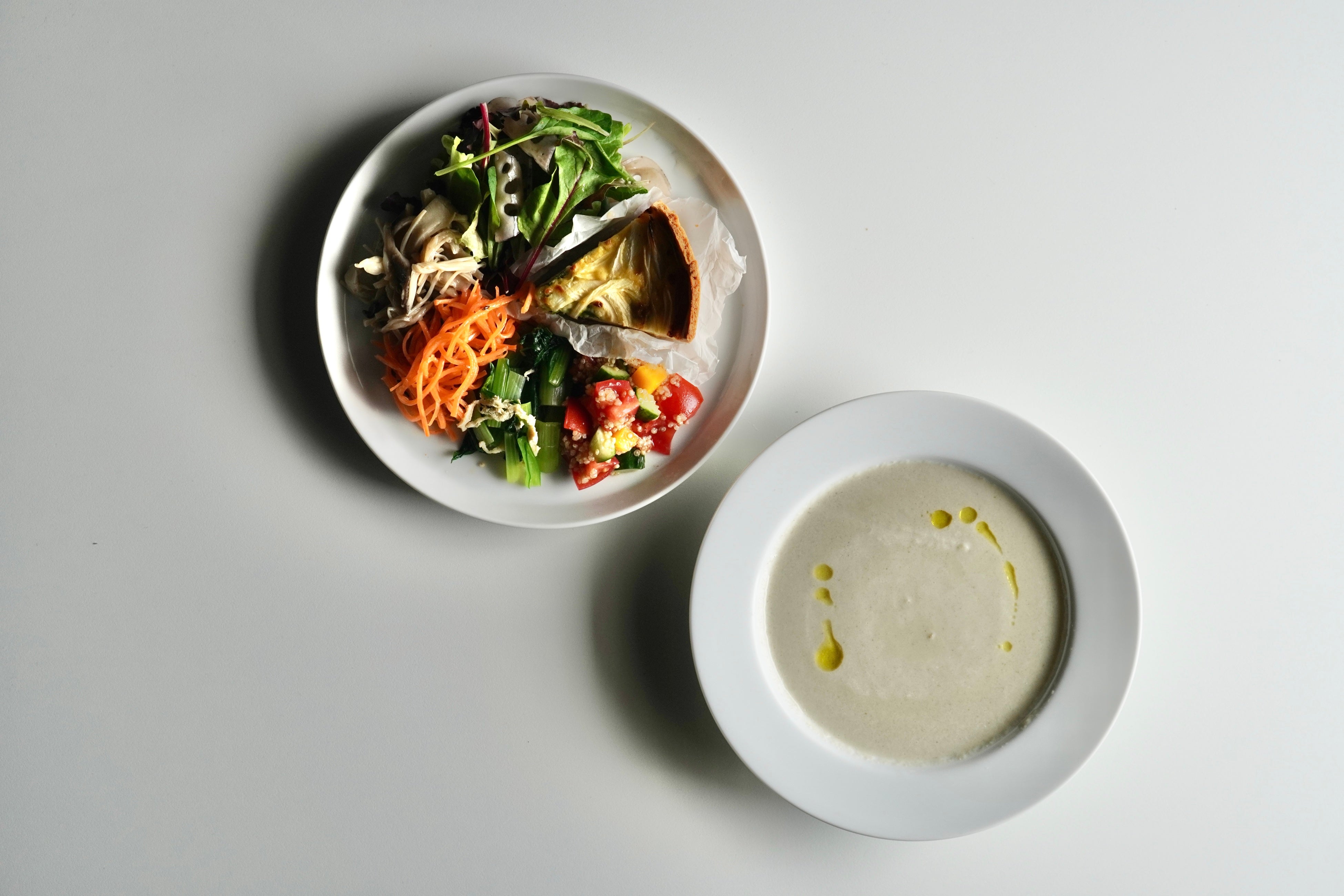 モッツァレラと野菜のキッシュ、キャロットラペ、キノコのプレゼ、自家製玉ねぎ麹のサラダ、キヌアのサラダ、小松菜のお浸し、牛蒡のポタージュ