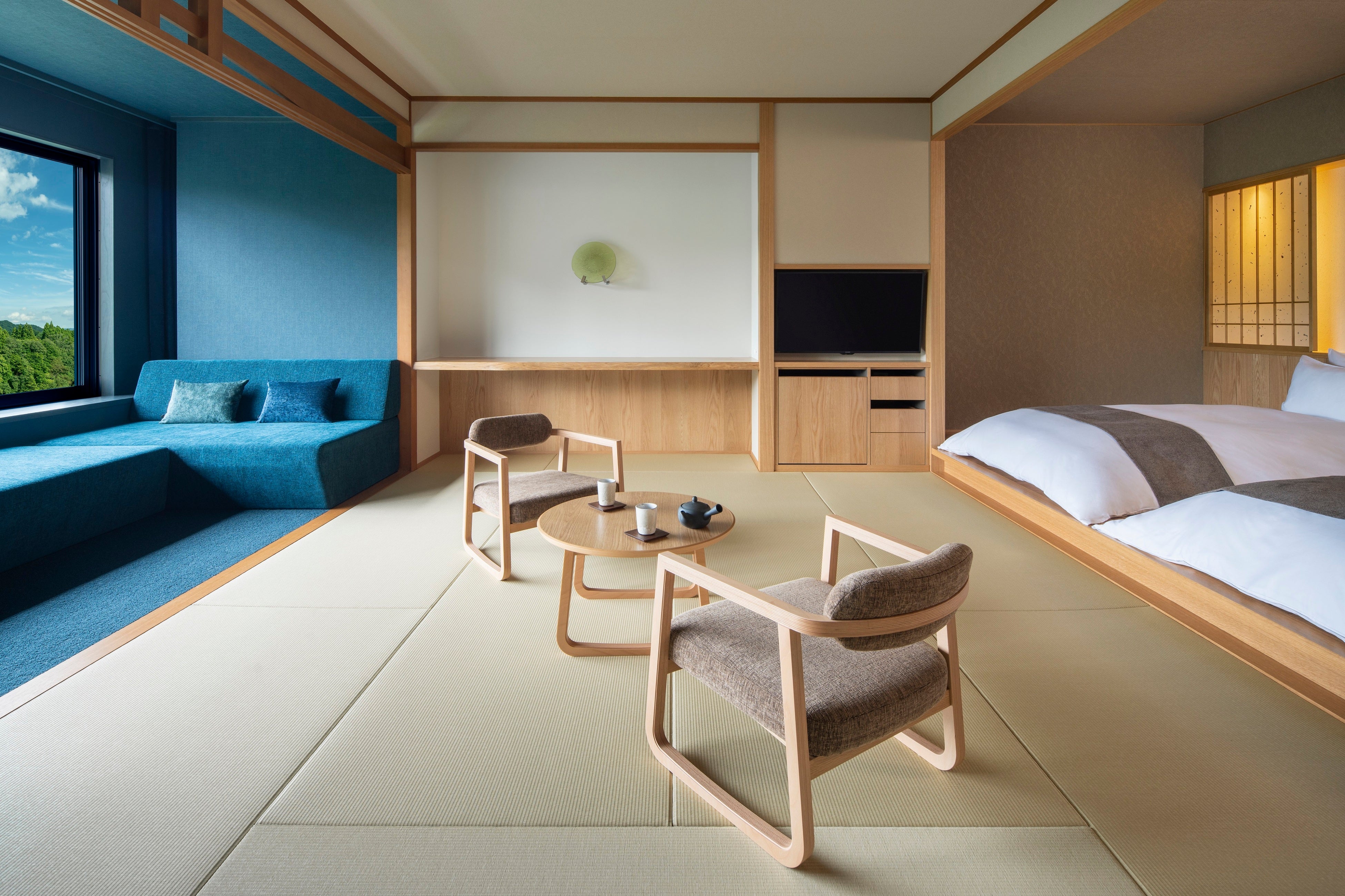「界」では、地域の文化に触れるご当地部屋を用意しています。界 秋保のご当地部屋は「紺碧の間」です。秋保温泉の景勝地である、名取川の峡谷「磊々峡(らいらいきょう)」が、かつて「紺碧の深淵」と表現されたことから着想を得ています(*2)。まるで紺碧色のフレームで切り取られたかのように、外に広がる四季の景色や渓流を楽しめます。また客室のデスクには、「仙台ガラス」のアートを配します。ゲストを出迎える部屋番号の札には、江戸時代から続く伝統工芸品の「白石和紙」を用い、寝室の障子にはこけしの柄が隠れているなど、宮城のご当地の要素を取り入れたしつらえにも触れるひとときを過ごせます。