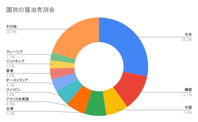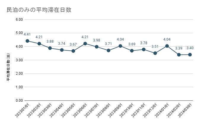 私たちの施設に宿泊したゲストの国別割合は国内旅行が最も多く、地域ではアジアが約70%を占めました。また、平均の宿泊滞在日数は、2023年の同時期と同じように2月と3月では短くなる傾向がありますが、滞在日数は短くなっております。そのため、近場で短期間の旅行を選択していると考えられます。
