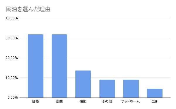 民泊を利用しているゲストは、民泊を身近と考えている層が全体の約80%を占めており、民泊ならではの魅力があると考えられます。実際に選んだ理由を聞いてみると、価格、空間を重視するゲストが60%以上となりました。