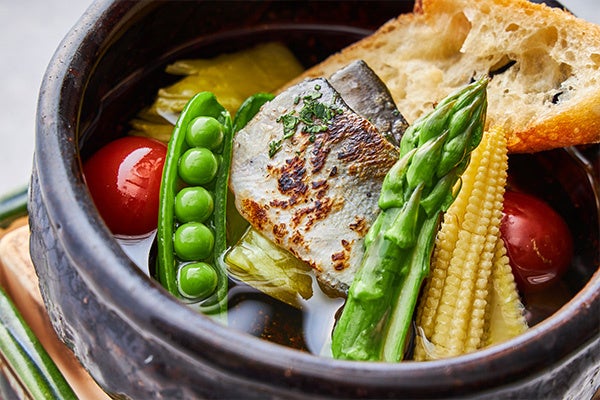 先付では初夏の緑をイメージする抹茶豆腐と、水たこをさわやかな香りとシャキシャキとした歯ざわりが特徴の旬の独活(うど)と合わせたカクテルをお楽しみいただけます。七輪料理は、鮎と旬野菜のトマト、スナップエンドウ、ヤングコーンをオリーブオイルで煮込み、蓼(たで)の葉(は)のほのかな苦みをアクセントに加えた一品です。炭火焼きでは2種類のお肉をお召し上がりいただけます。深みある豊かなコクと香ばしい香りが特徴の醤油糀に漬け込んだ“大山どり”は、炙り焼きにてご用意いたします。柔らかな肉質の“奥州いわいどり”は、独特の香りとお肉の持つ凝縮された旨味を堪能いただけるように燻製にしました。一皿で異なる味と食感をお楽しみください。食事でもしっかり旬を感じていただけるように、しらすがたっぷりのった御飯をご用意しました。デザートは、見た目にも涼やかな抹茶のヴェリーヌをご賞味ください。