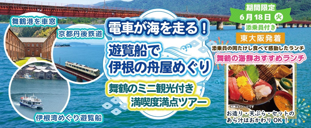 お一人様13,800円!先着25名様限定〈東大阪発着〉6月18日(火) 電車が海を走る!遊覧船で伊根の舟屋めぐり 舞鶴のミニ観光付満喫度満点ツアー
