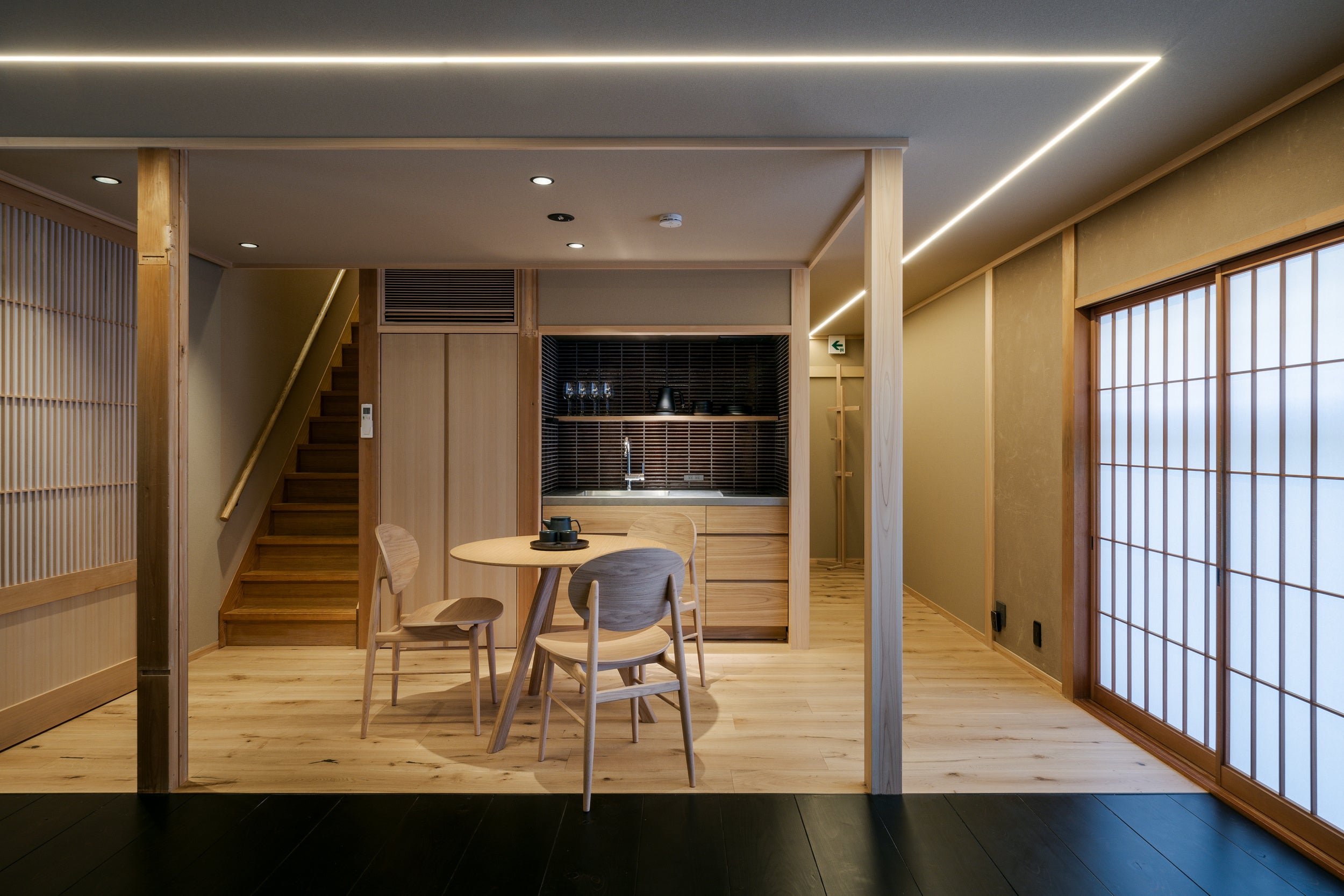 京都の街並みに合った空間を前提に、和とモダンのイメージを融合した施設が誕生しました。1階は奥行きの少ない一般住居の古家から、リビング・ダイニング・お風呂が広々と一面に広がるモダンな空間になるように間取り変更を行い、2階は元々の居空間を活かす形でリノベーション。1階、2階で全く違った宿の雰囲気を感じられる作りになっています。さらに、京都市建築物等のバリアフリーの促進に関する条例の観点から、外部から玄関にかけてスロープを設置し、Uターンの形状にしたため、車椅子の方なども過ごしやすい空間になっています。