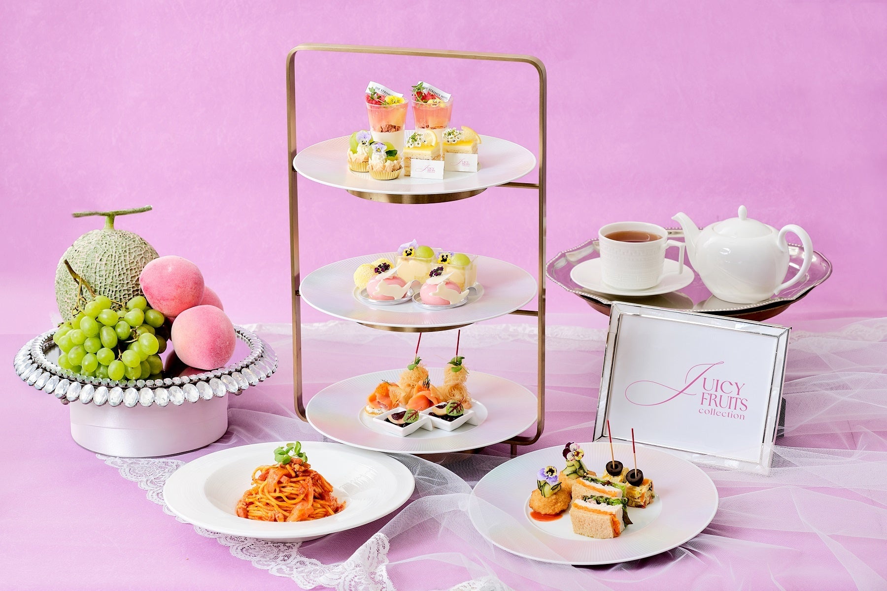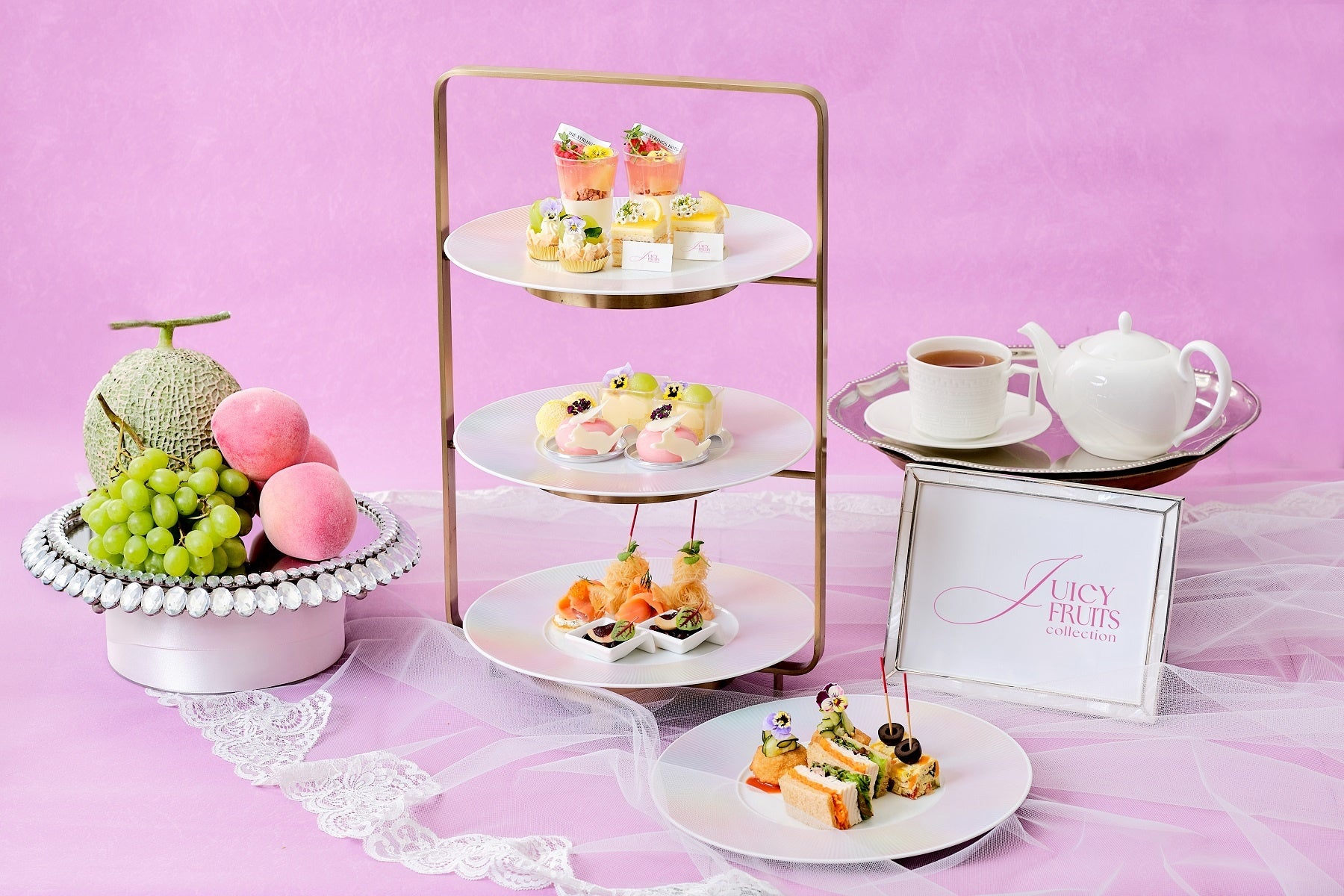 スイーツは、みずみずしいシャインマスカットをふんだんに使用したタルトや、白桃の果実とジュレをアーモンドのブランマンジェに重ねて仕上げた優美なひんやりスイーツ、フレッシュメロンの贅沢トライフル、レモンバタークリームとレモンガナッシュをサンドした爽やかなガトーオペラ、薔薇の風味を効かせた桃とラズベリーのムースなど初夏を感じられる色合いと味わいが調和した6種をご用意。特製セイボリーには、スモークサーモンにケッパーを効かせたサワークリームとフレンチキャビアのブリ二や、ぷりぷりの小エビのカダイフ巻き、トリュフが香るマッシュルームリゾットのコロッケ仕立て、彩り豊かな5種野菜のスパニッシュオムレツなど計6種類をご堪能いただけます。
