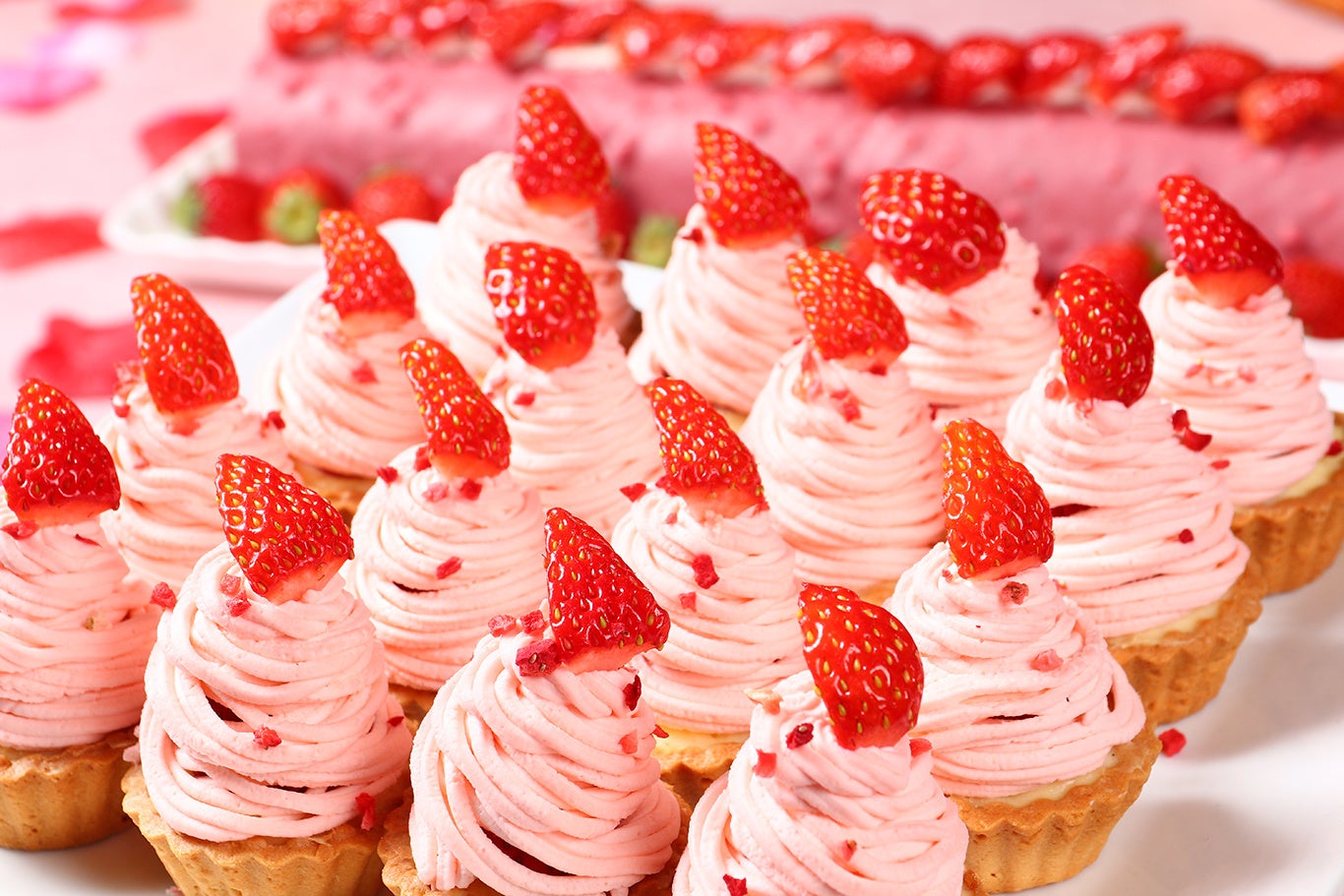 キラキラと輝く苺が宝石のような「苺タルト」やふんわり食感がたまらない「苺のモンブラン」など全23種類からなるスイーツブッフェを主とし、スモークサーモンや生ハムなどお好みのトッピングで楽しむ「ブルスケッタボード」などのセイボリーブッフェ、ご注文をいただいてから出来立てをご用意するパティシエからの特別な一皿「苺のクレープシュゼット バニラアイス添え」など、味覚と視覚を共に満たす贅沢なメニューをお届けいたします。ドイツの老舗紅茶メーカー・ロンネフェルトの紅茶を含む全14種類の飲み放題とのペアリングが演出する贅沢なひと時をお楽しみください。