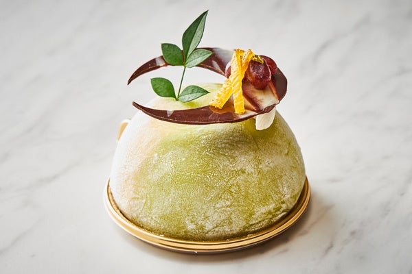宇治抹茶の風味豊かなムース、こしあんのクリーム、柚子のクーリを、もちもち食感の抹茶の求肥で包みました。なめらかなムースの口どけをお楽しみいただける、和テイストのケーキです。