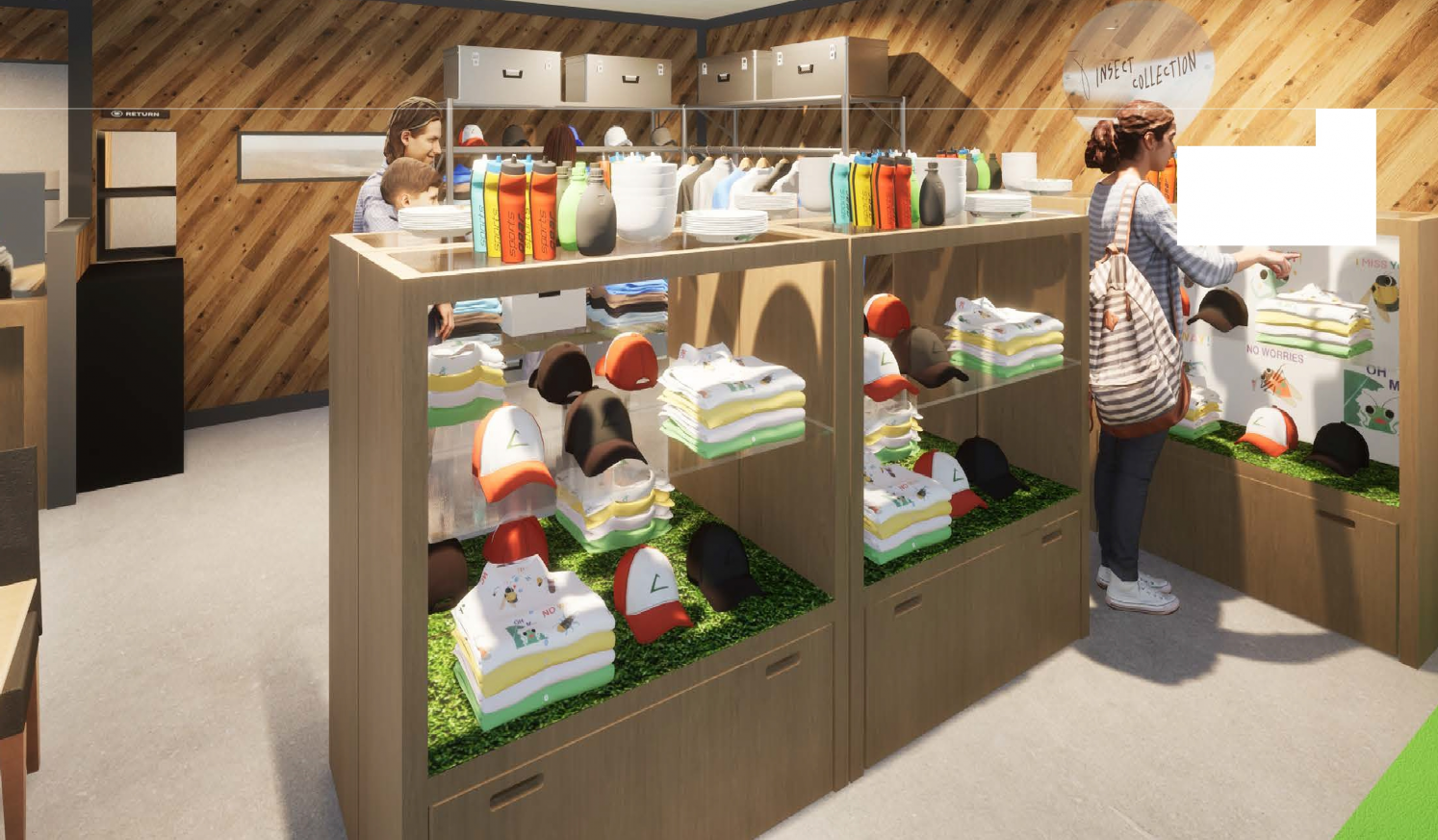 その他にも、SNS世代を中心に幅広い層から支持されるCOIN PARKING DELIVERY(コイン パーキング デリバリー)の、愛嬌と毒々しさを共存させたポップなキャラクターグッズや、学用品や昆虫モチーフのおしゃれな子供服「Insect Collection(インセクトコレクション)」のアイテム、無添加のおやつ、離乳食などショップエリアも充実し、皆さまをお迎えします。