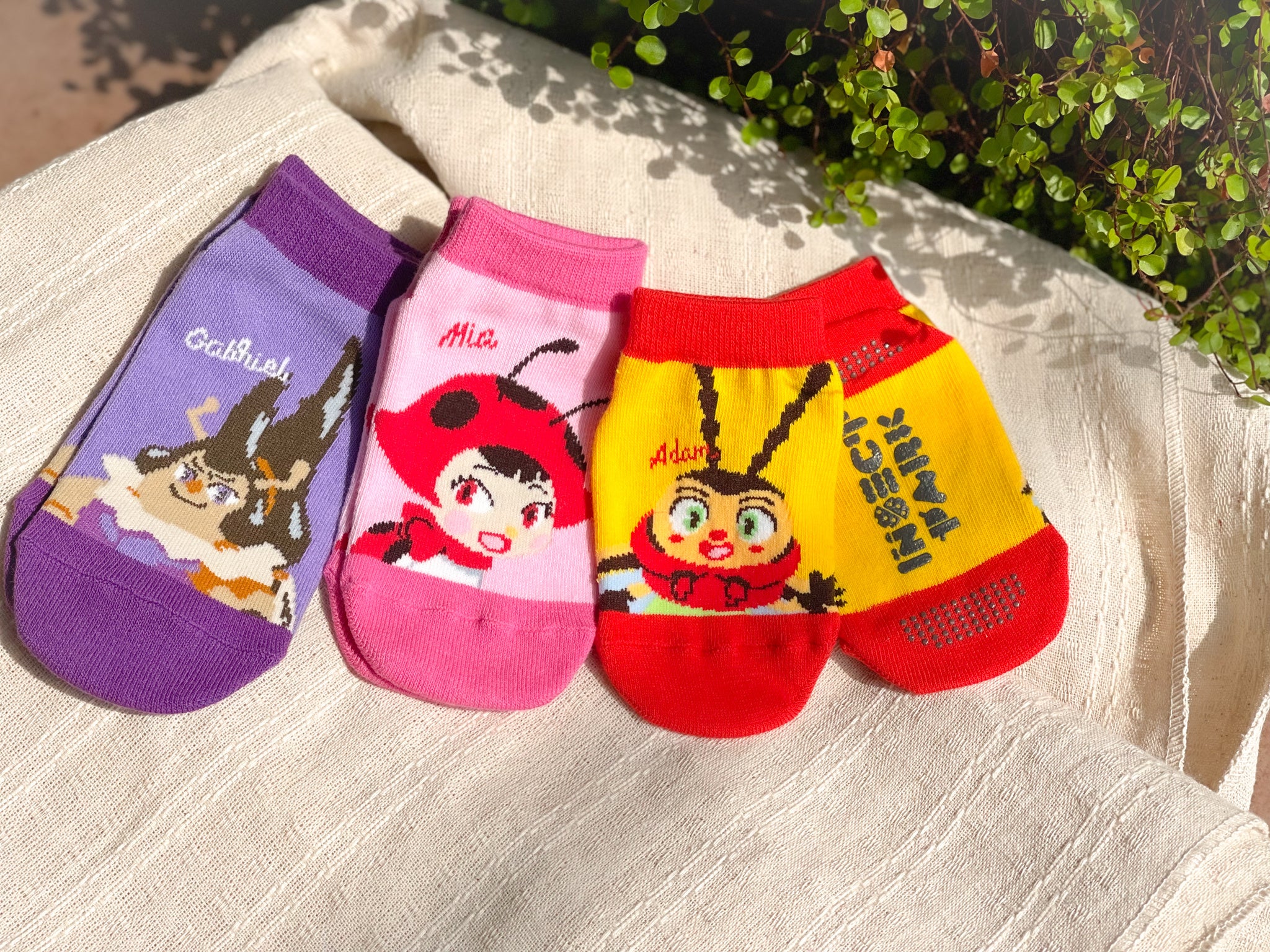 ※ノベルティソックスは全9種類。写真は一部です(左からガブリエル・ミア・アダム)