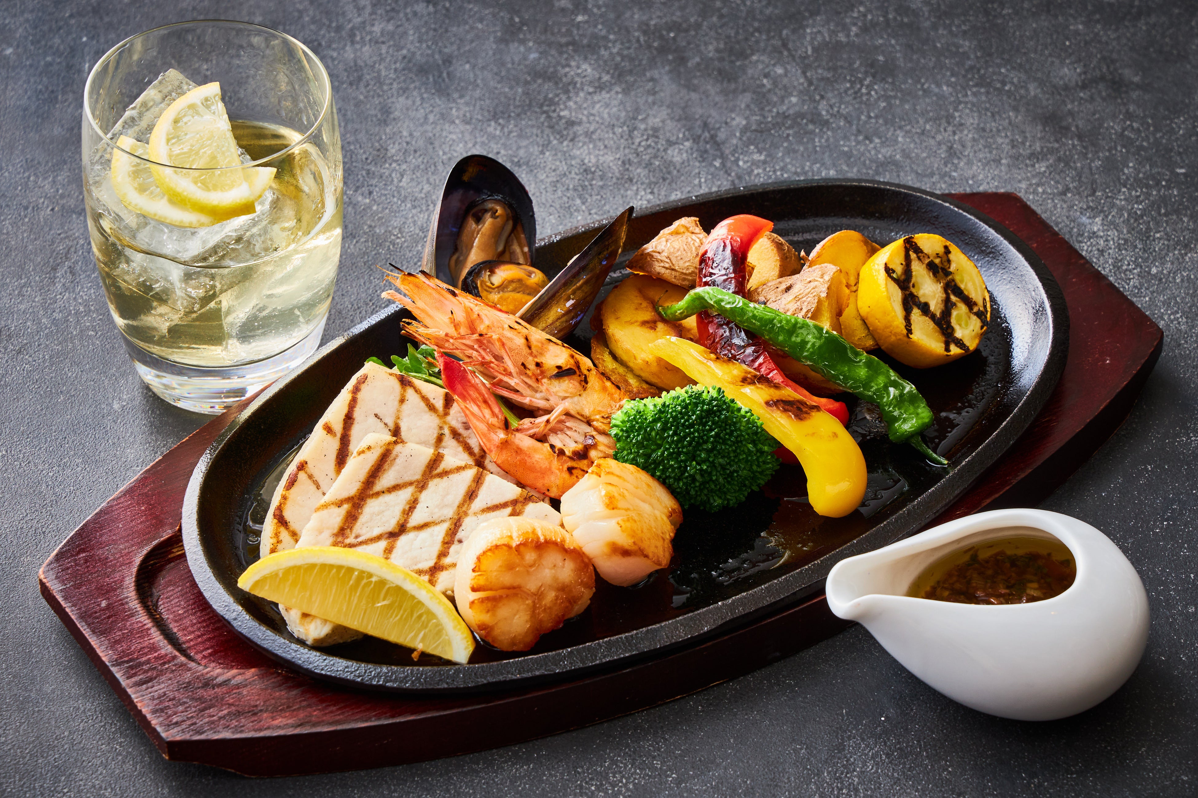 カジキ鮪・海老・帆立貝のグリルプレート 特製バルサミコソース
