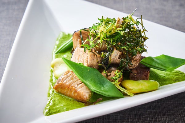「ロブスターサンド」はホテルメイドのバケットにオマール海老と甘海老を挟み、2種類のこだわりソースでお召し上がりいただける逸品です。また、新緑をイメージする鮮やかなソースが特徴的な「高知県産鰹のサルタート ガルム風味 小松菜のソース」では、にんにくと魚醤でマリネし、しっかりした味付けで香ばしくソテーした鰹をご堪能ください。その他にも、初夏の旬の素材を楽しめるアラカルトメニューを取り揃えております。